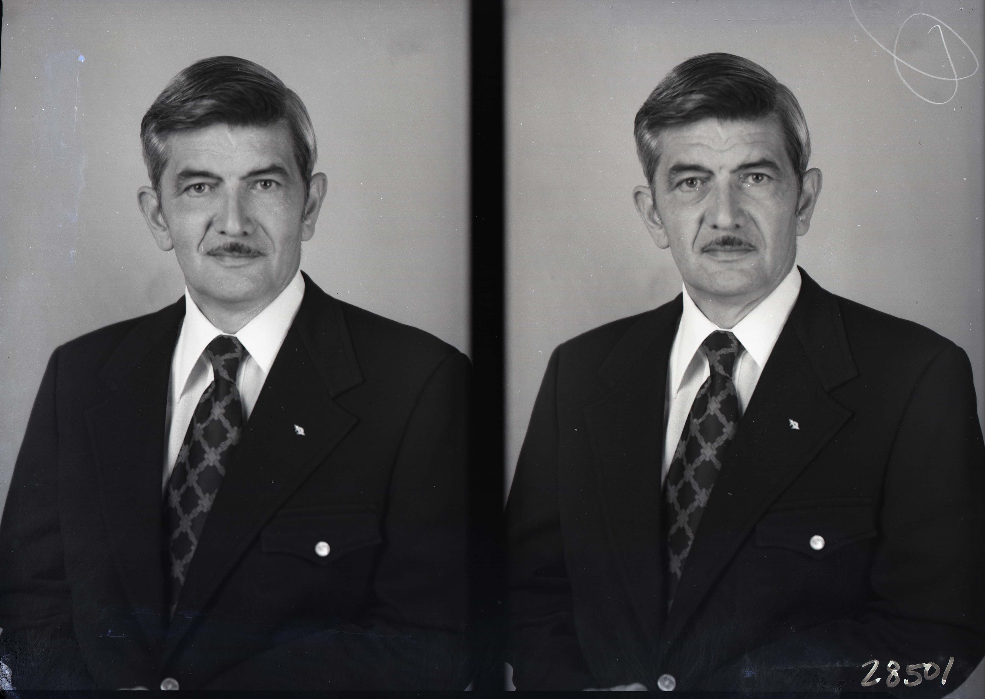 Photo of two separate portrait photographs of M. Blair Zirkle, Jr. with a thin mustache and wearing a suit and tie.