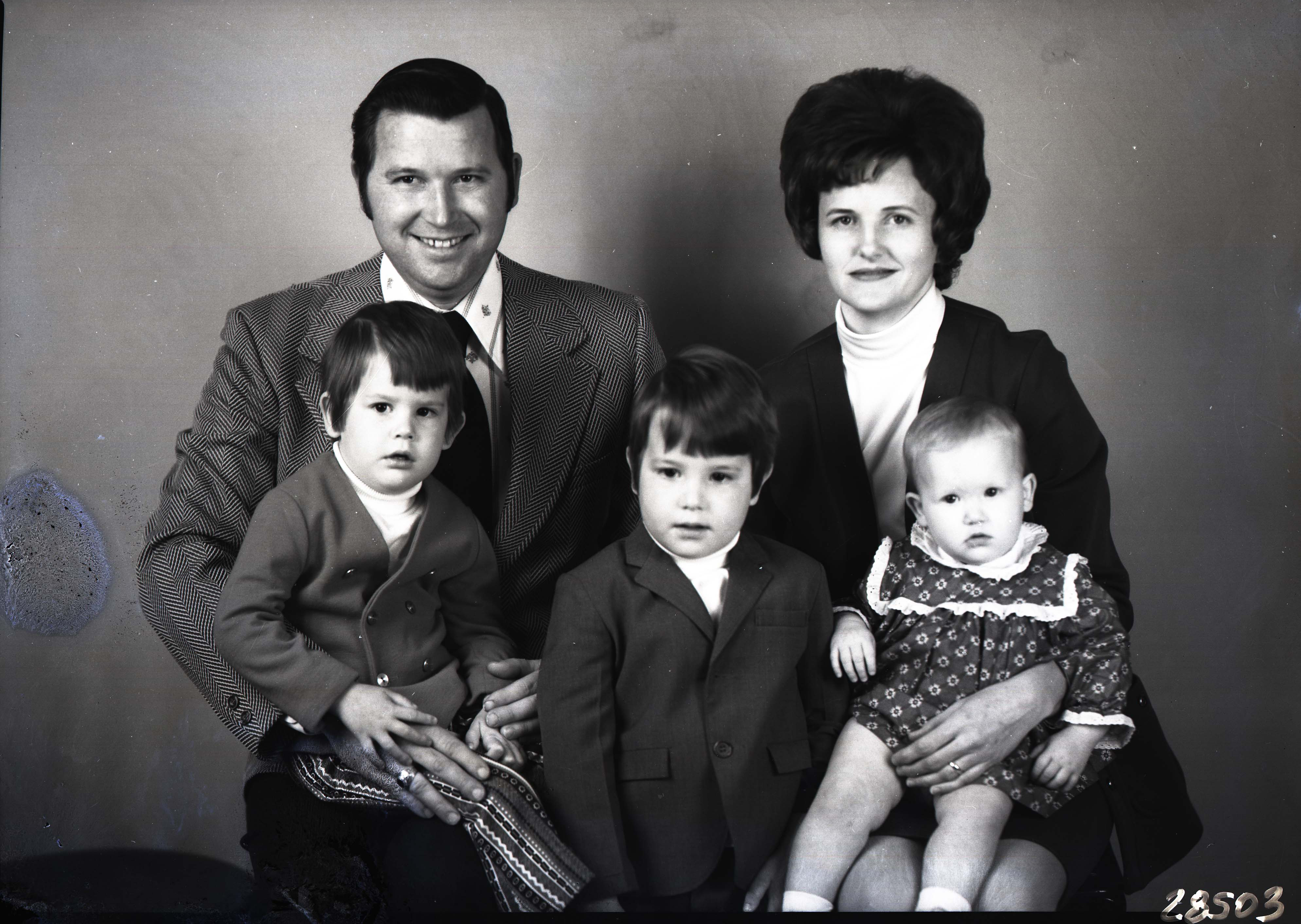 Photograph of Ronald "Ronnie" W. Rinker and his wife, Mary Ann (Zerkel) Rinker seated together with three young children, two boys and a girl, posed with them.