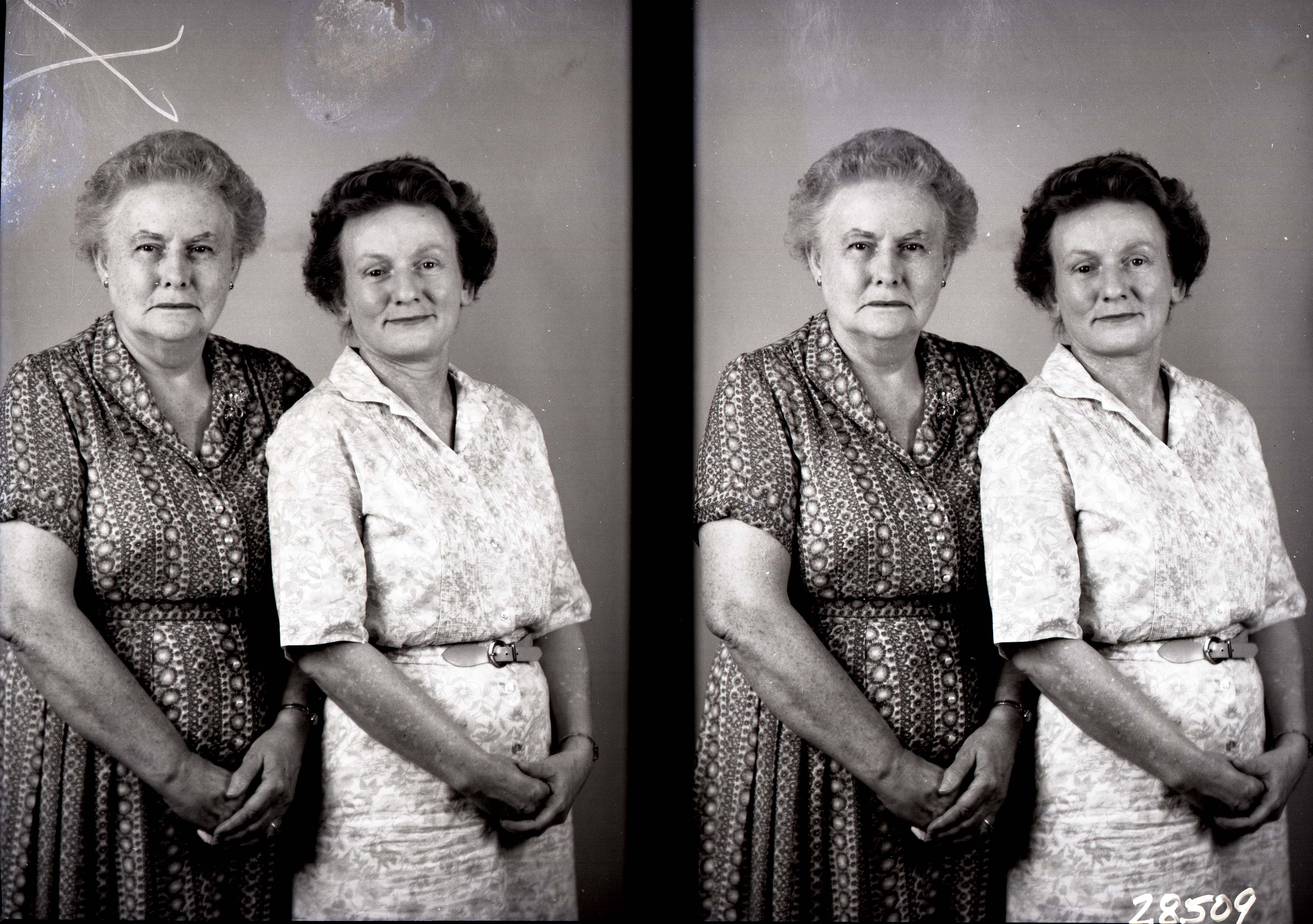 Photo of two separate photographs of Strasburg sisters, Virginia (left) and Cora Ann Lemley (right).