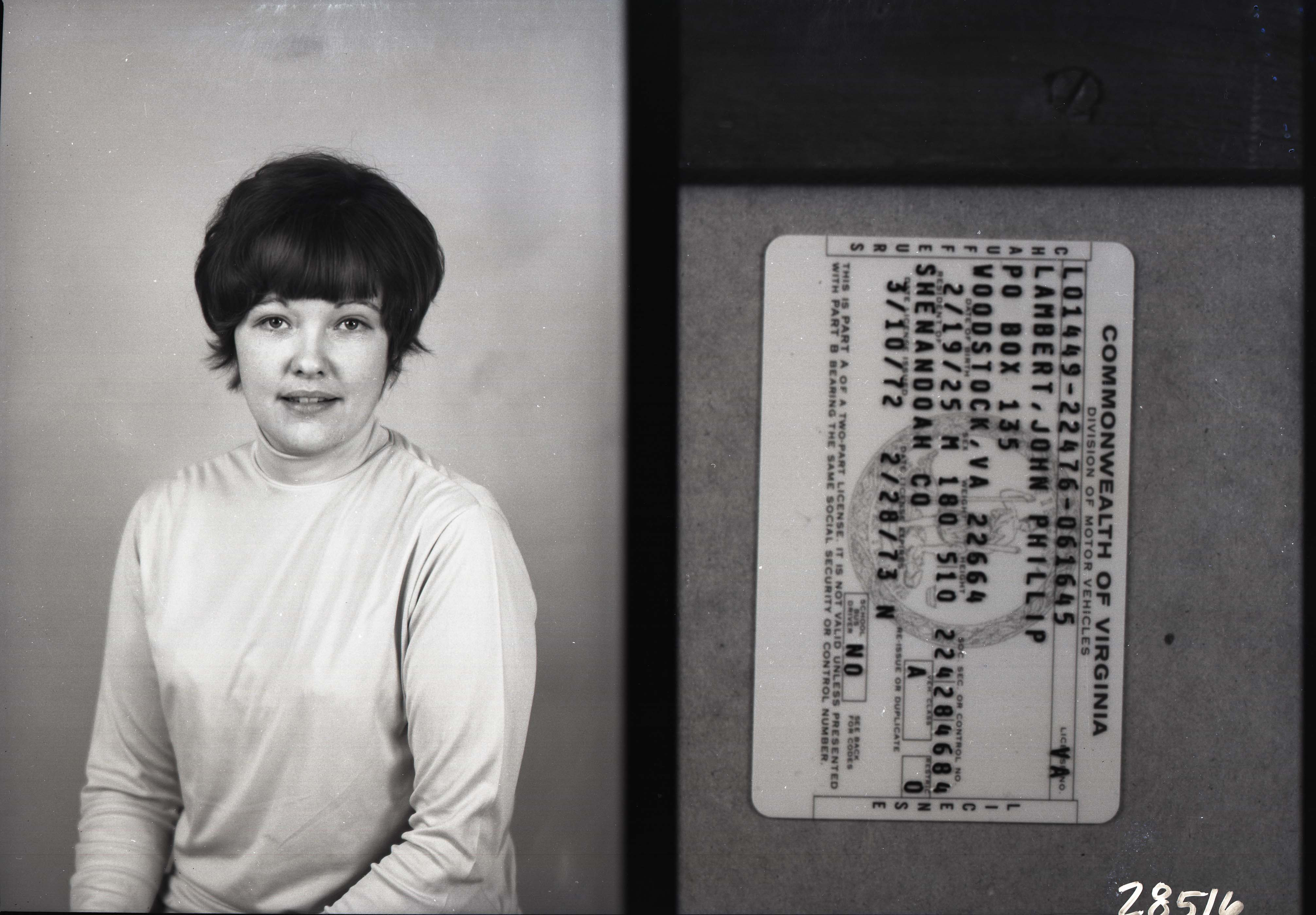 On the right is a photograph of the Virginia Driver's License issued in March 1972 to John Phillip Lambert of Woodstock.
