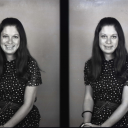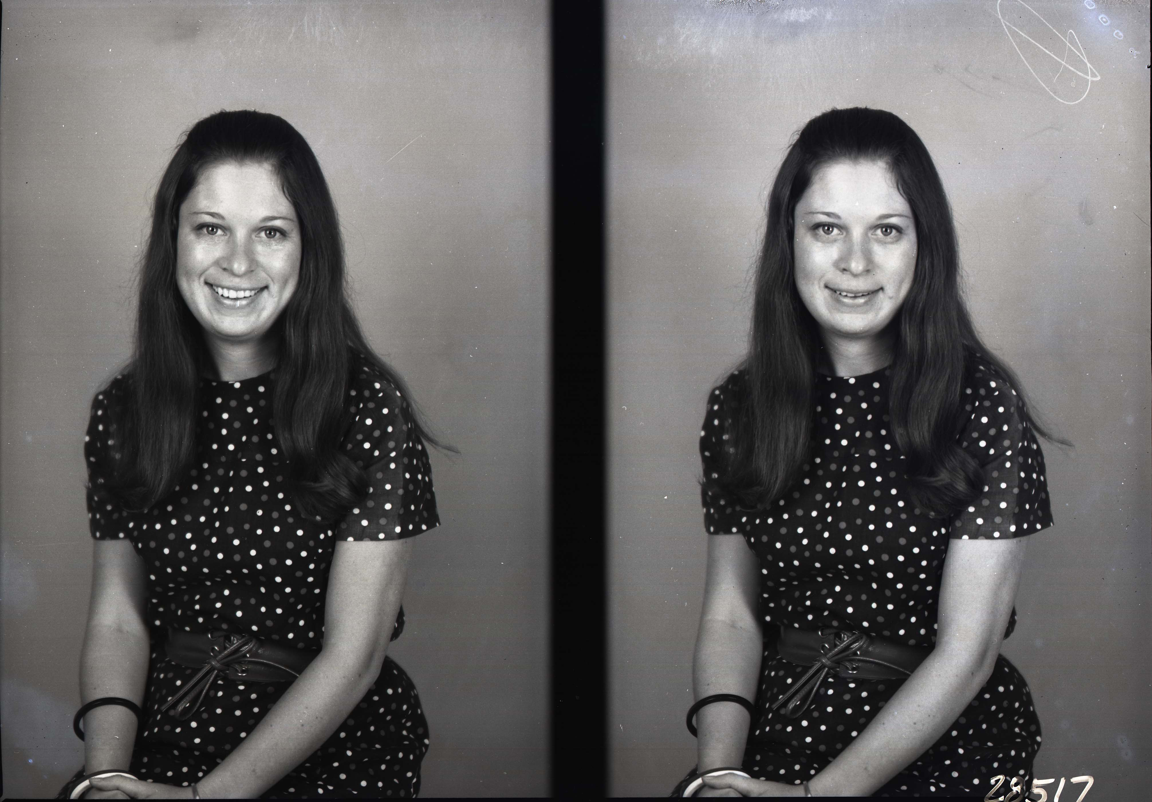 Photo of two separate portrait photographs of an unidentified young woman with long hair and wearing a polka-dotted dress with a belt.