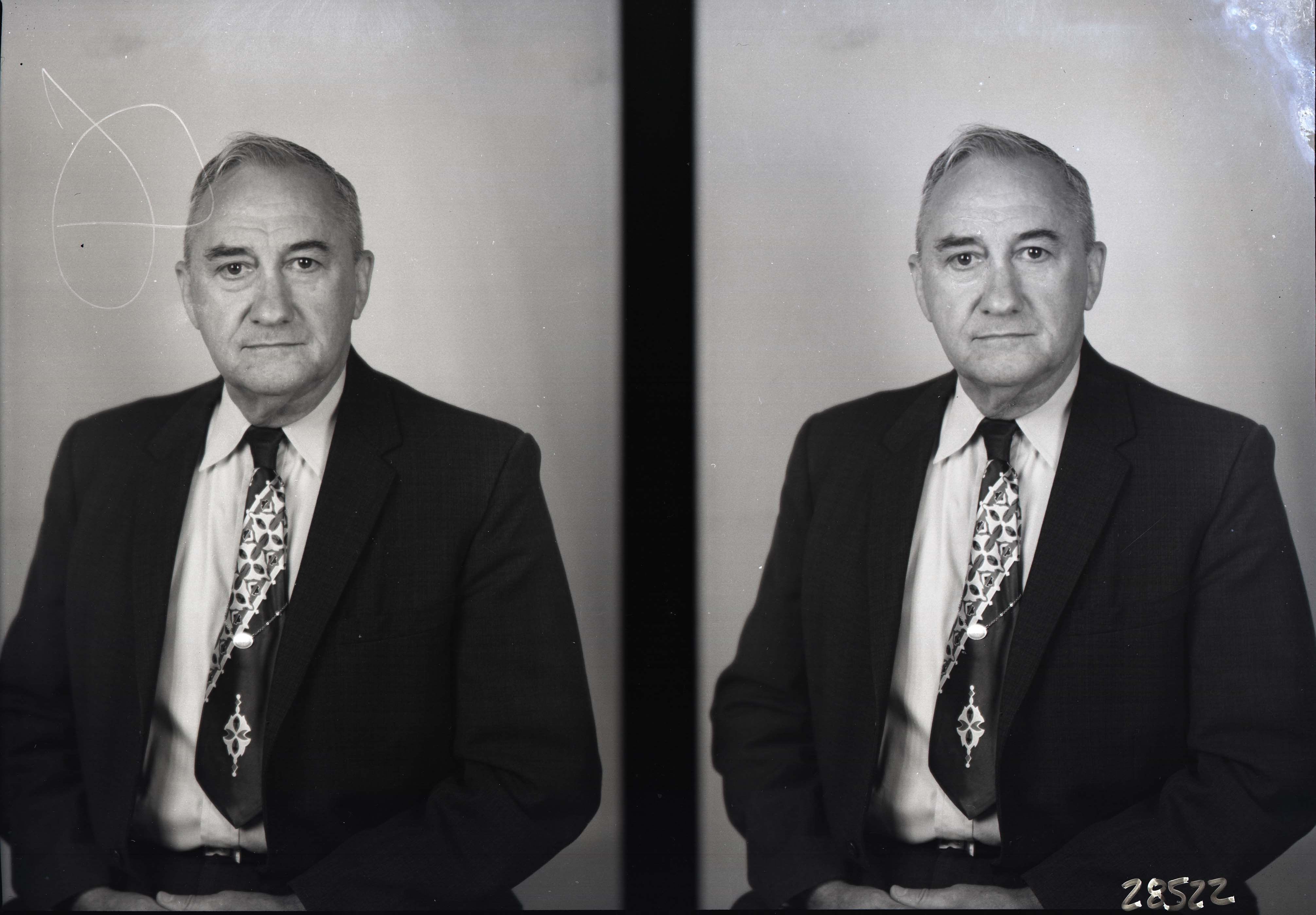 Photo of two separate portrait photographs of Berlin Elwood Helsley wearing a suit and tie.