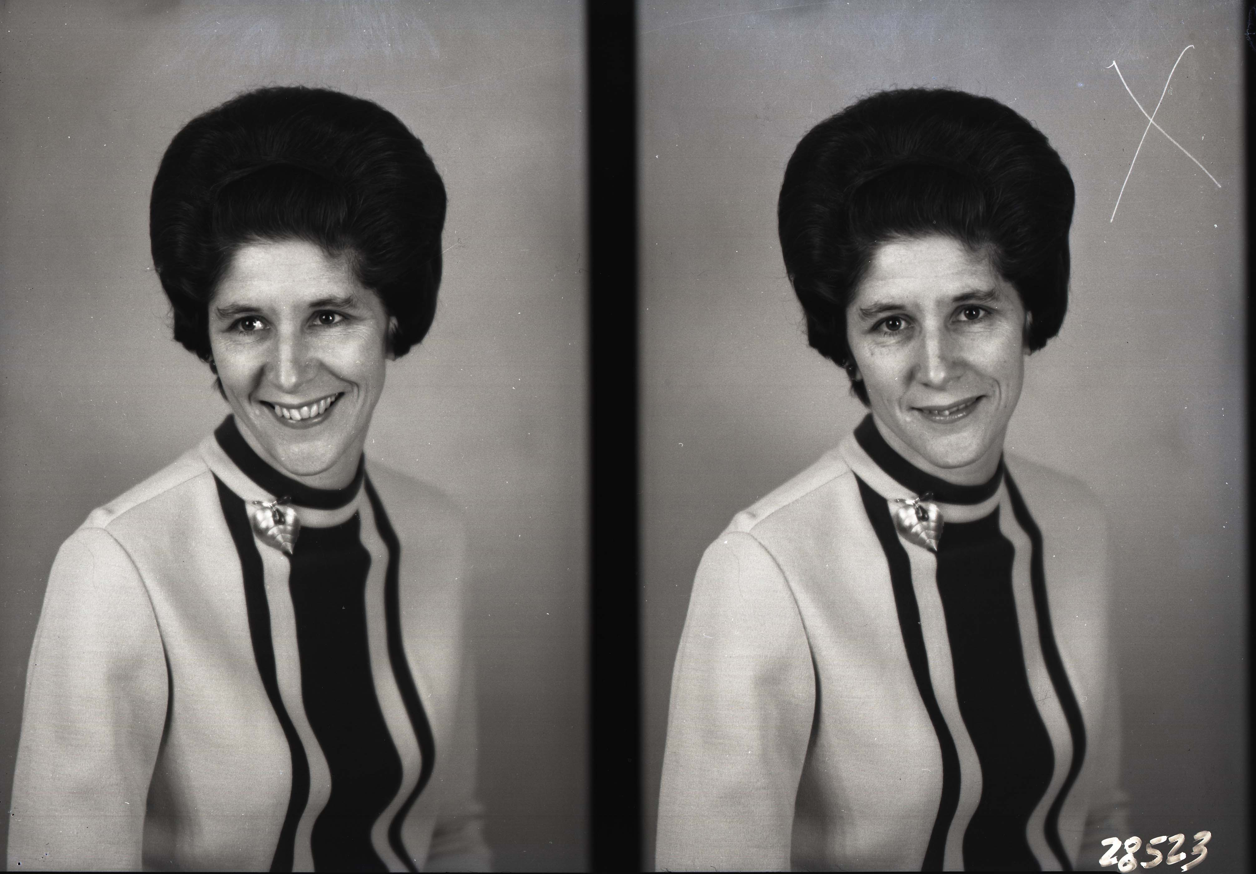 Photo of two separate portrait photographs of an unidentified woman wearing a pin on the collar of her dress.