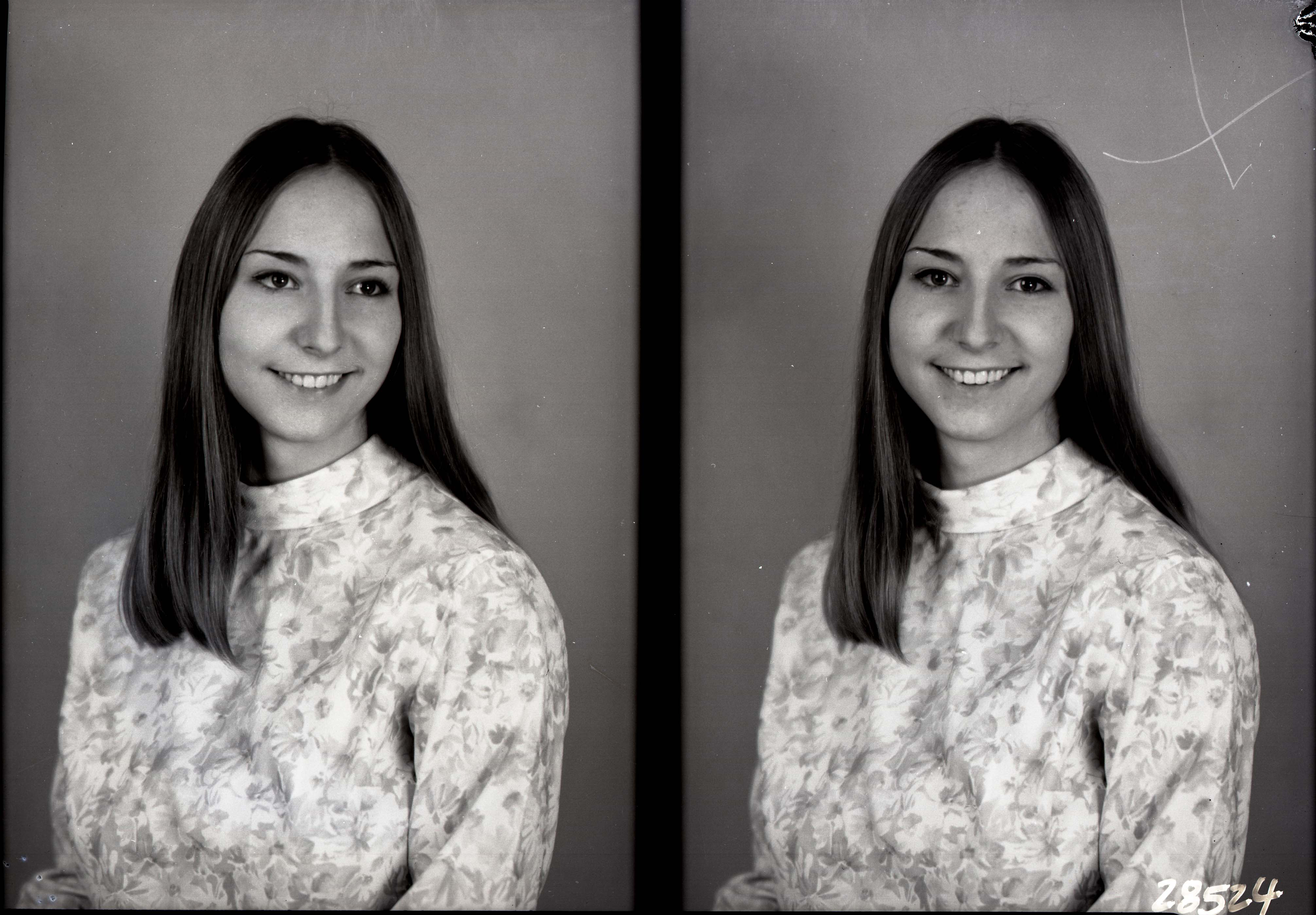 Photo of two separate portrait photographs of an unidentified young woman with long hair.