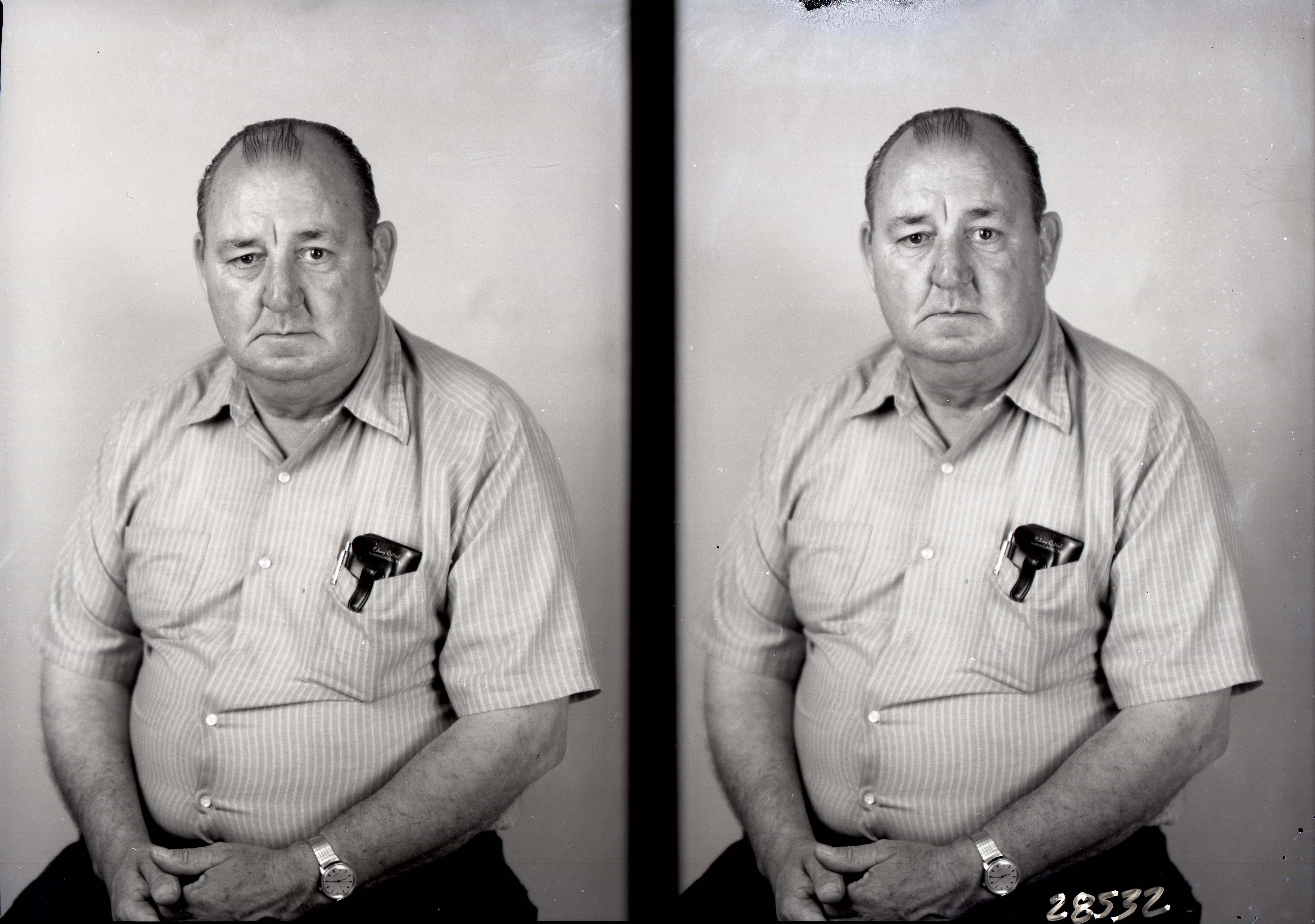 Photo of two separate portrait photographs of "Oakie" Litten wearing a short-sleeved, striped shirt.