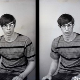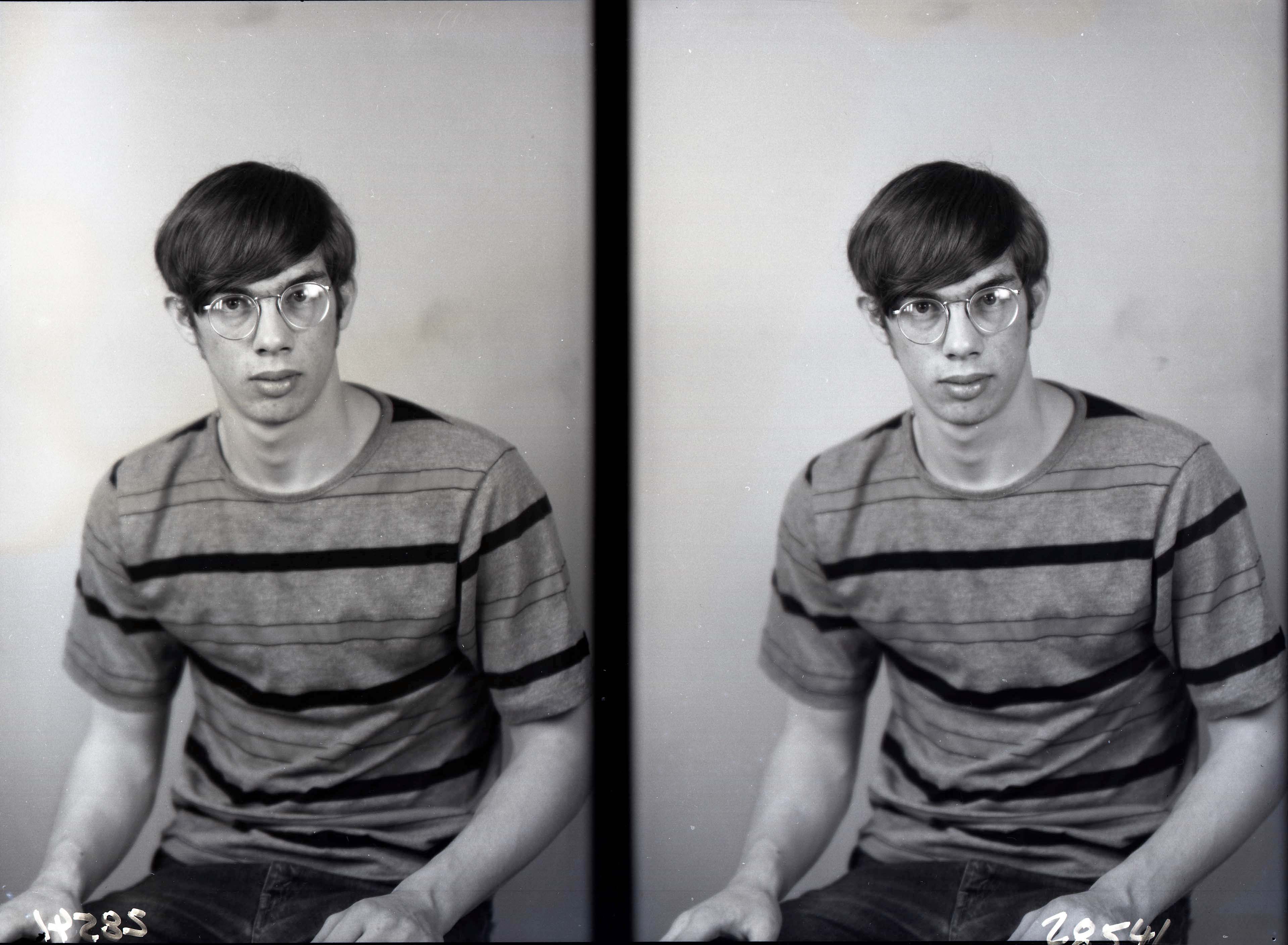 Photo of two separate portrait photographs of the same unidentified young man wearing glasses and a horizontally-striped t-shirt.