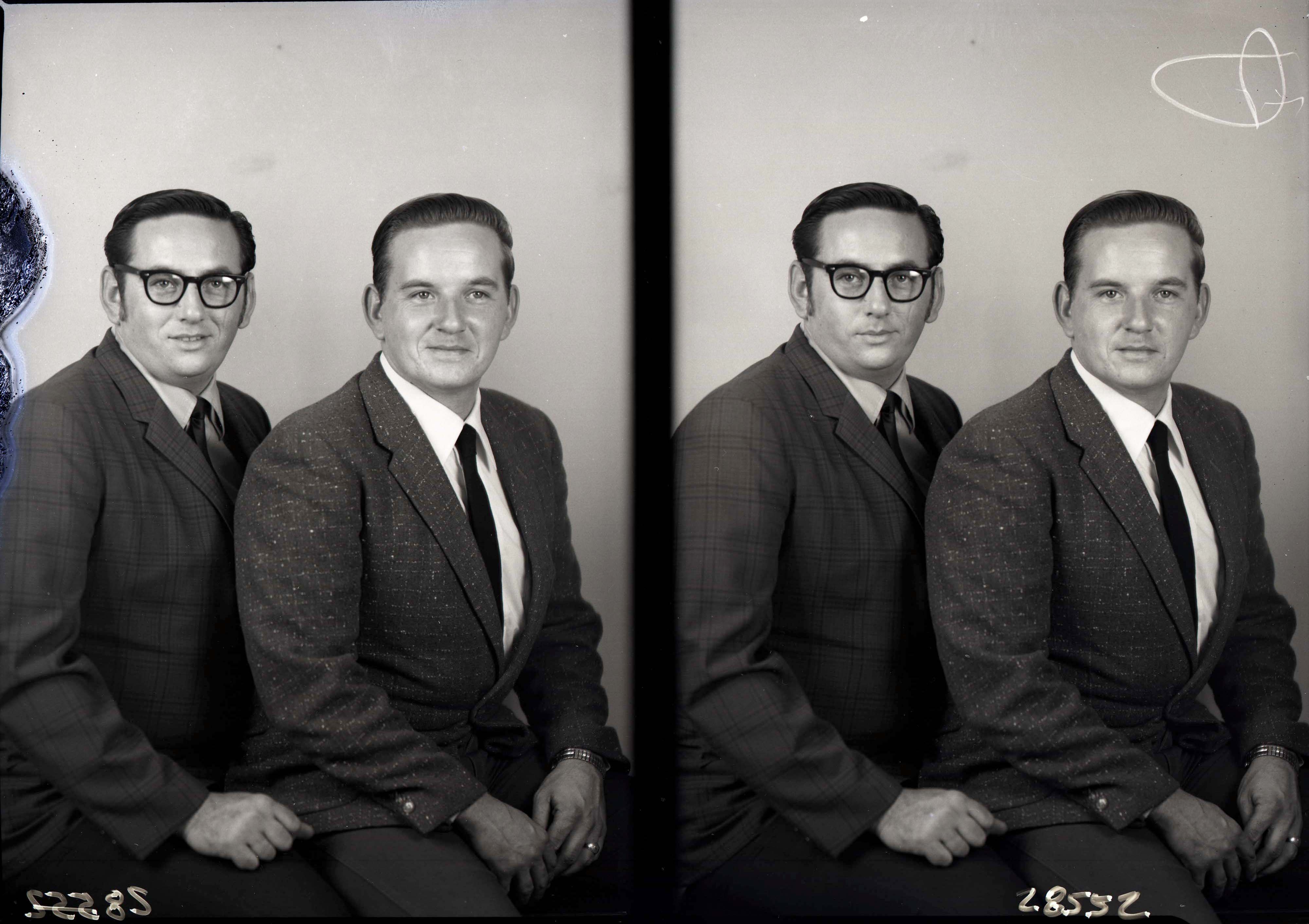 Photo of two separate portrait photographs of two unidentified men posed together.