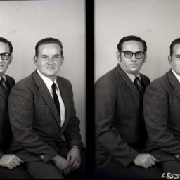 Both are wearing suits and ties. The man on the left has glasses and sideburns.