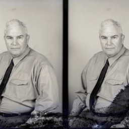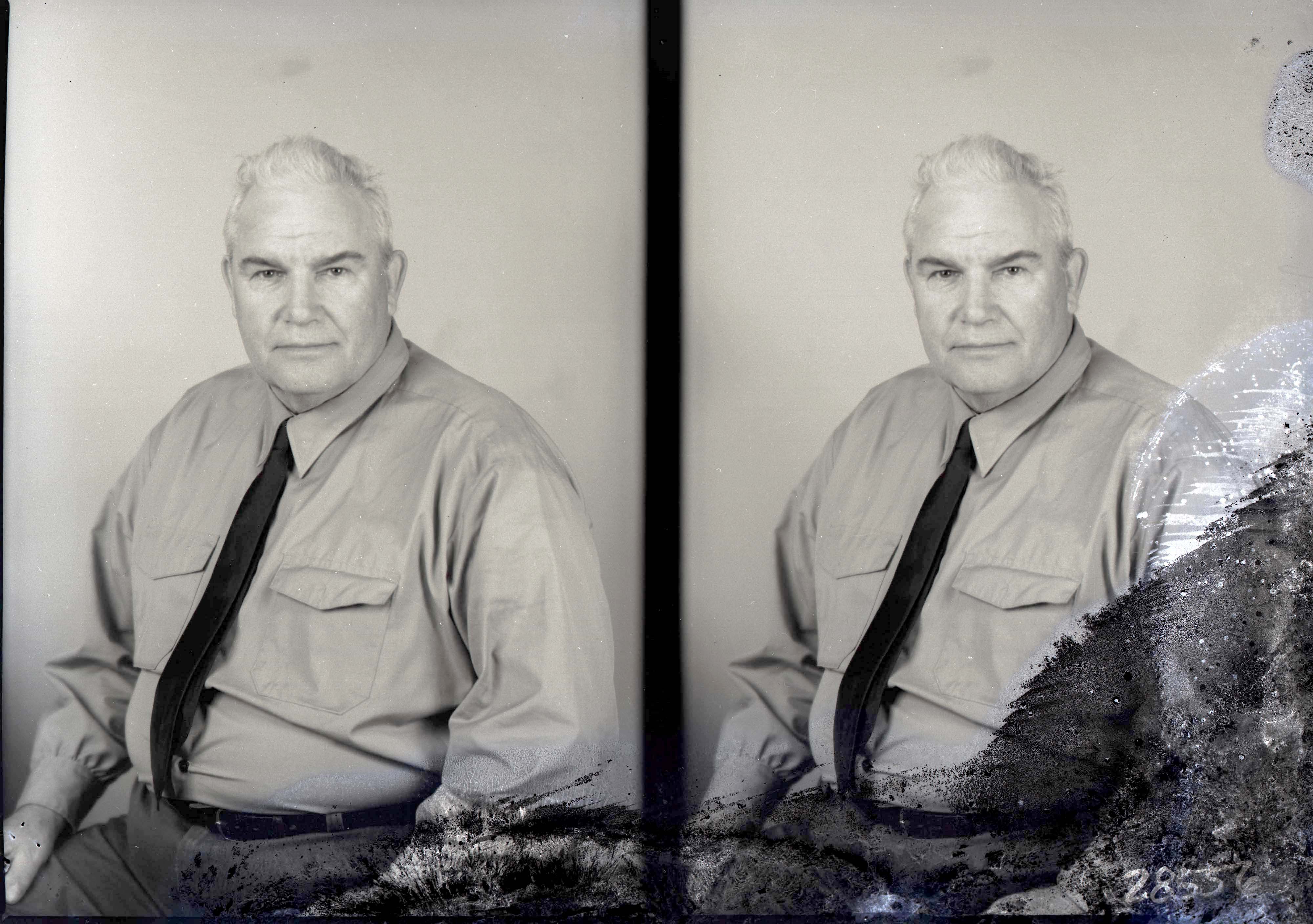 Photo of two separate portrait photographs of the same unidentified man in a shirt and tie.