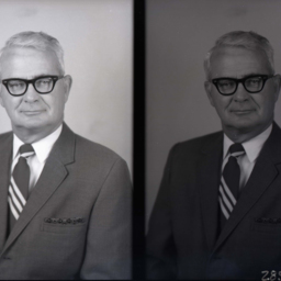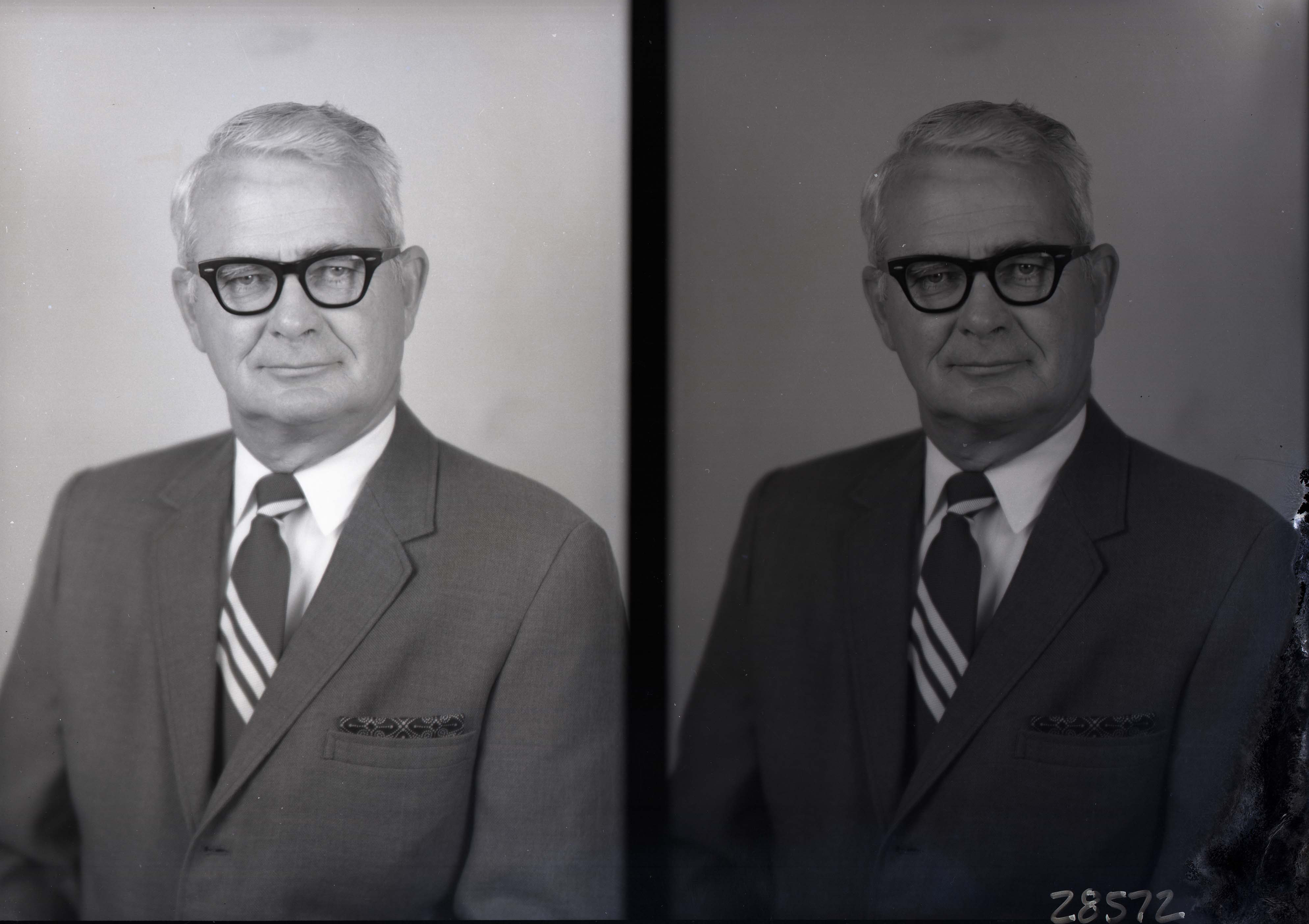 Photo of two separate portrait photographs of an unidentified man with glasses and wearing a suit and striped tie.