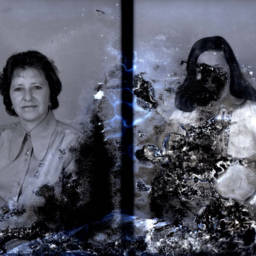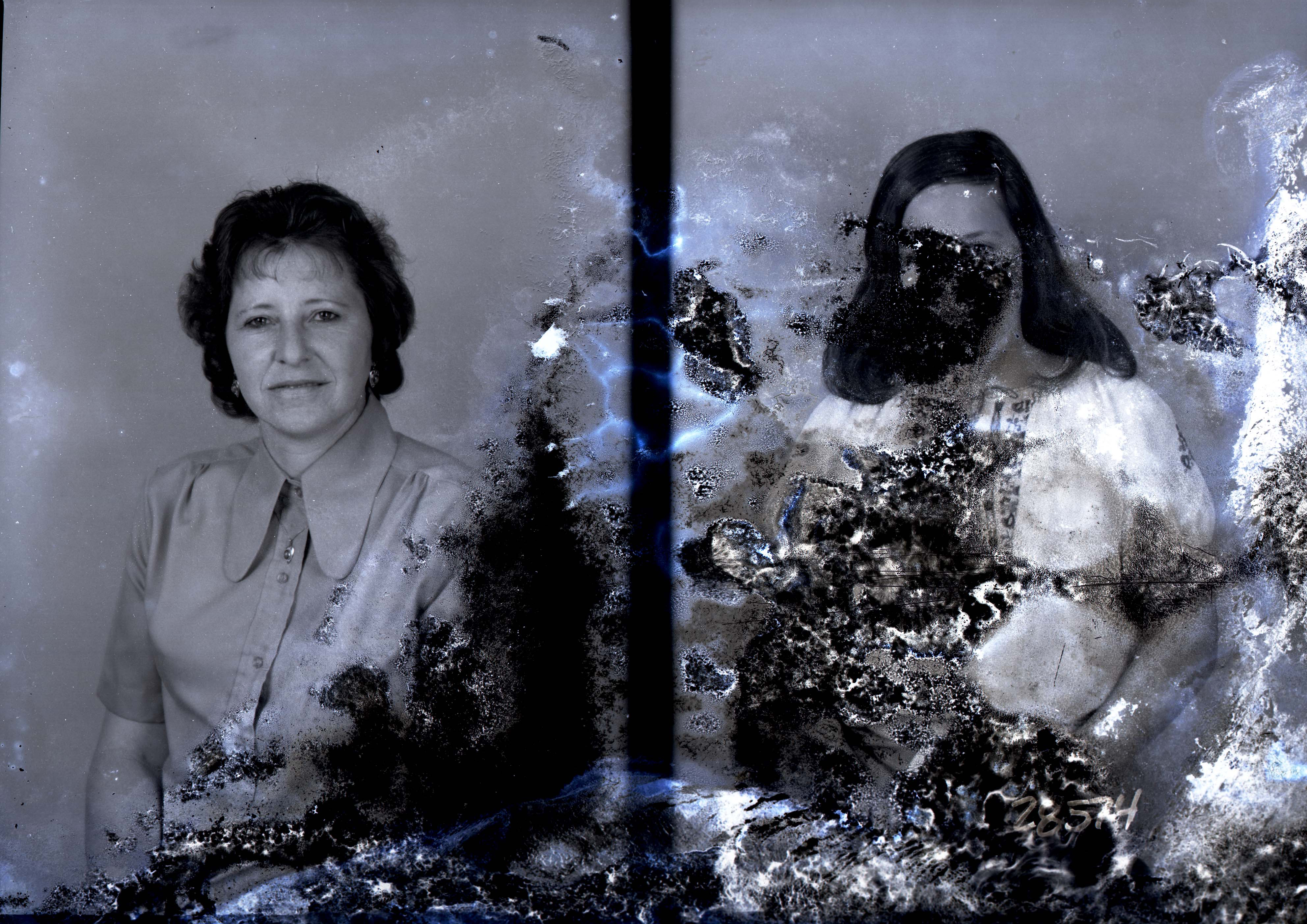 The image on the right has significant emulsion damage that obscures the woman's face.