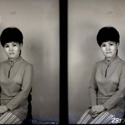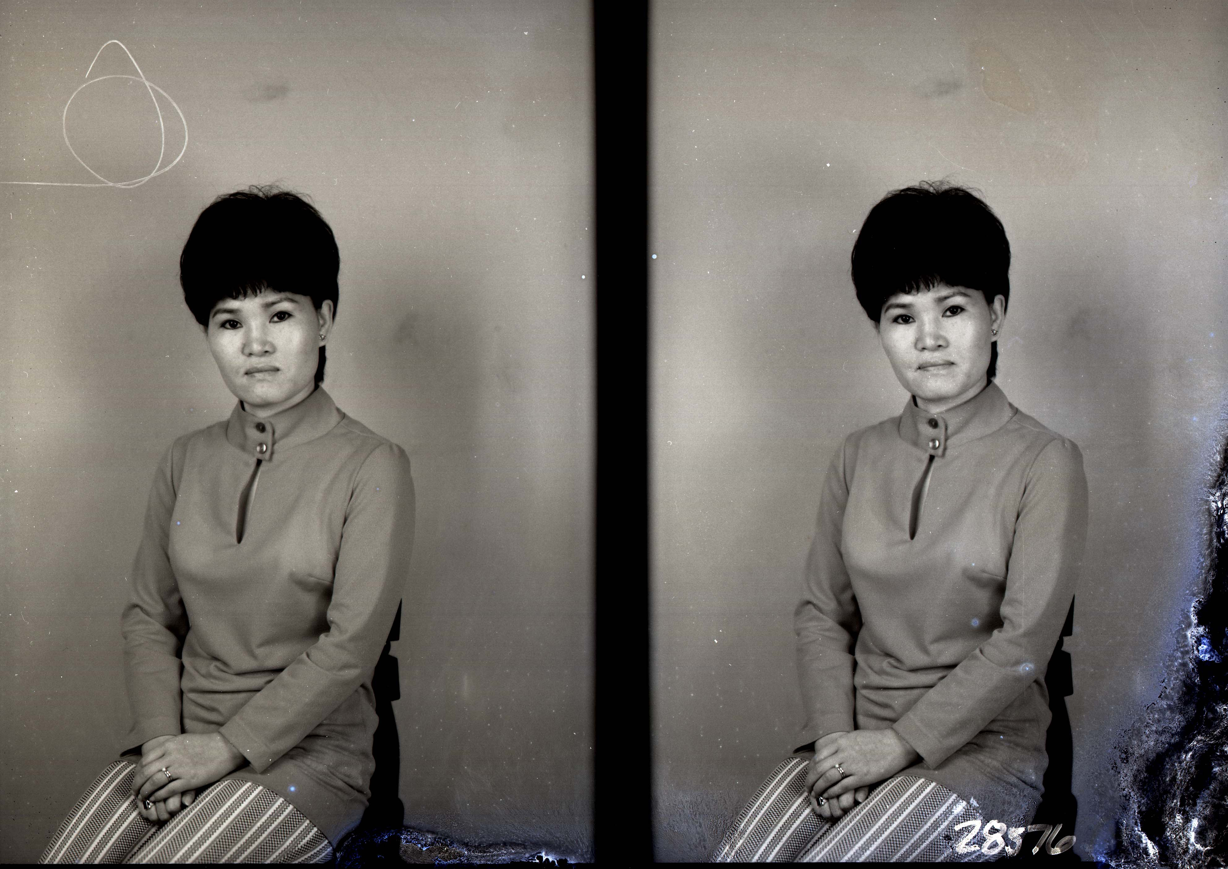 Photo of two separate photographs of the same unidentified young woman with short hair and seated with her hands in her lap.