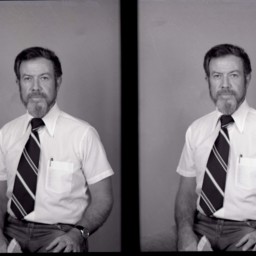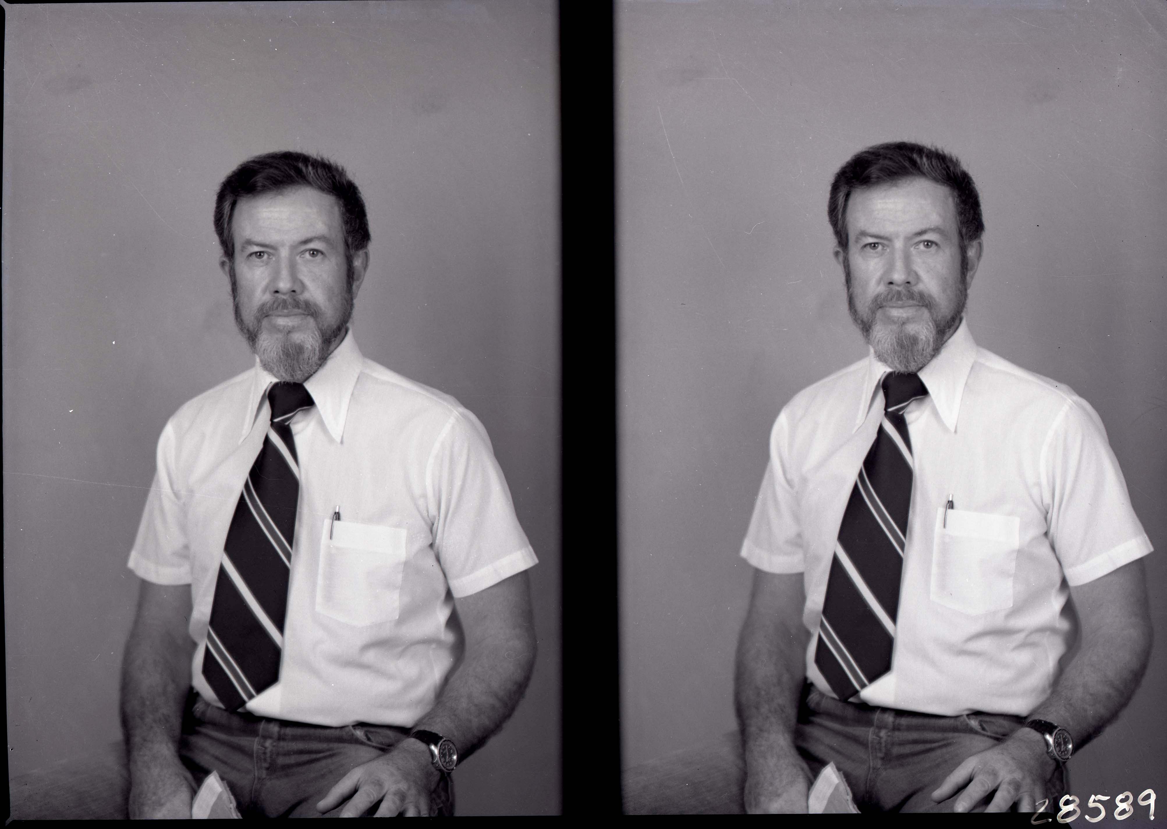 Photo of two portrait photographs of the same unidentified man with a mustache and beard wearing a short-sleeved shirt and striped tie.