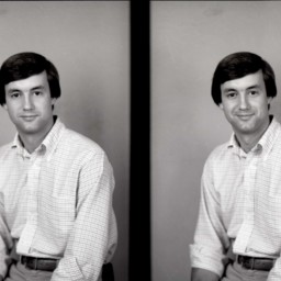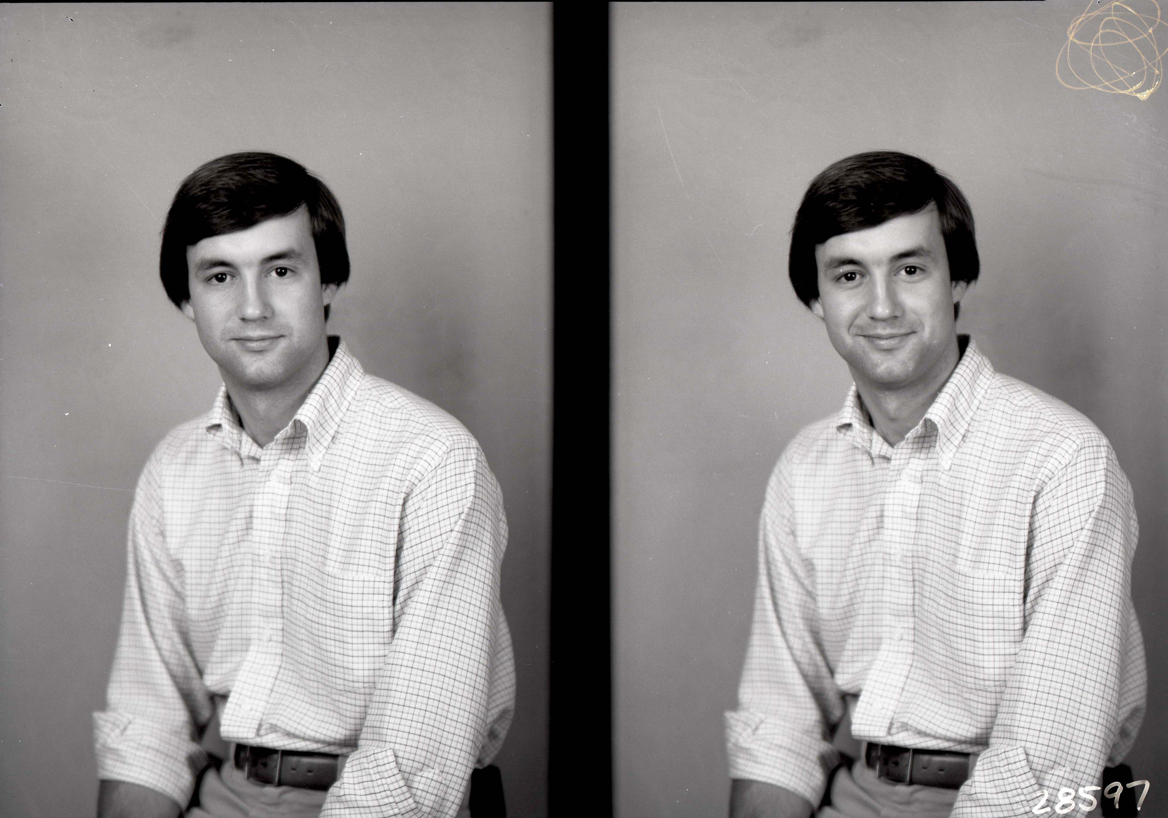 Photo of two separate portrait photographs of the same unidentified young man wearing a checkered shirt with the sleeves rolled up.