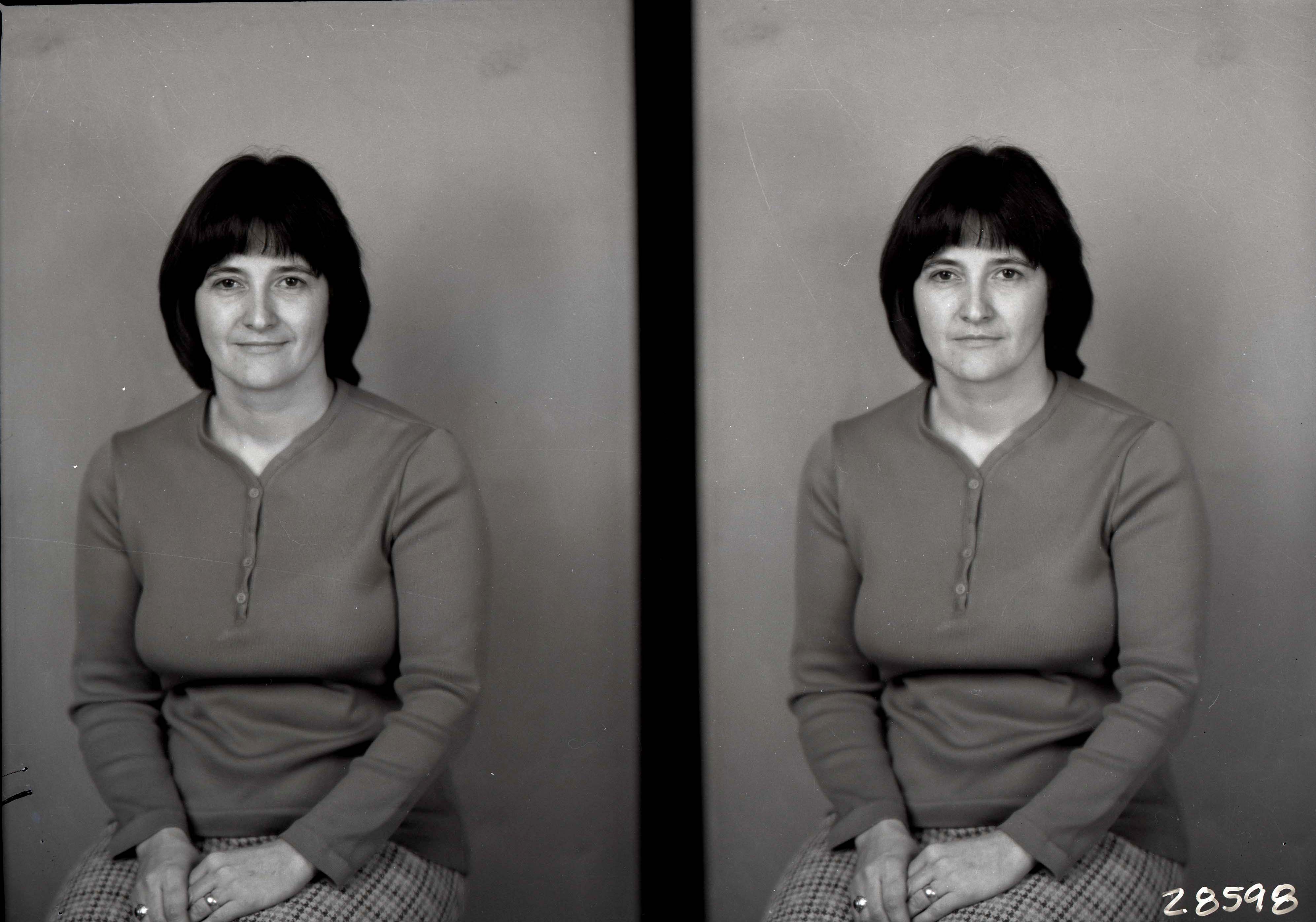 Photo of two separate photographs of an unidentified woman with short, dark hair, seated with her hands in her lap.