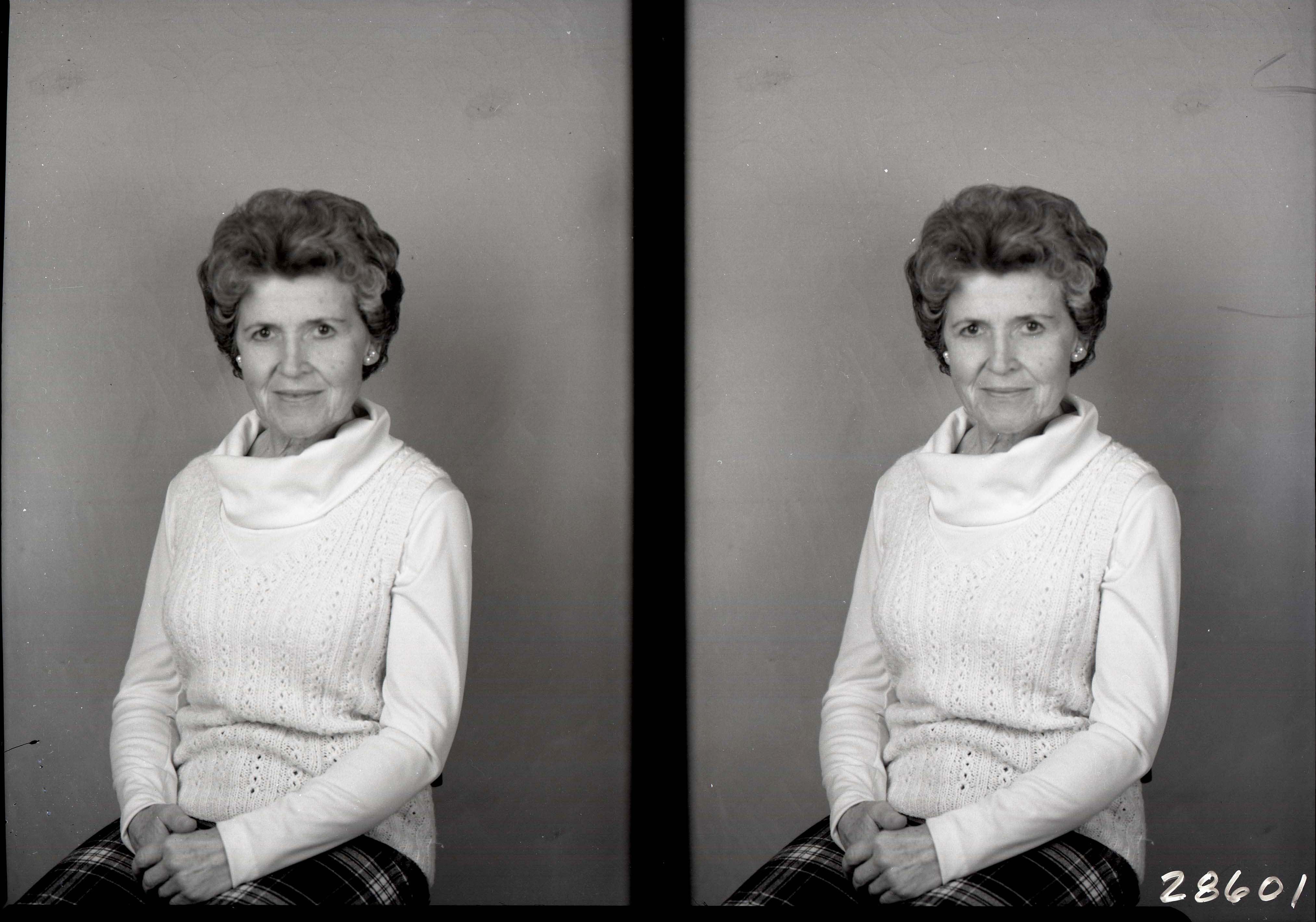 Photo of two separated portrait photographs of the same older unidentified woman with styled hair and wearing a plaid skirt.