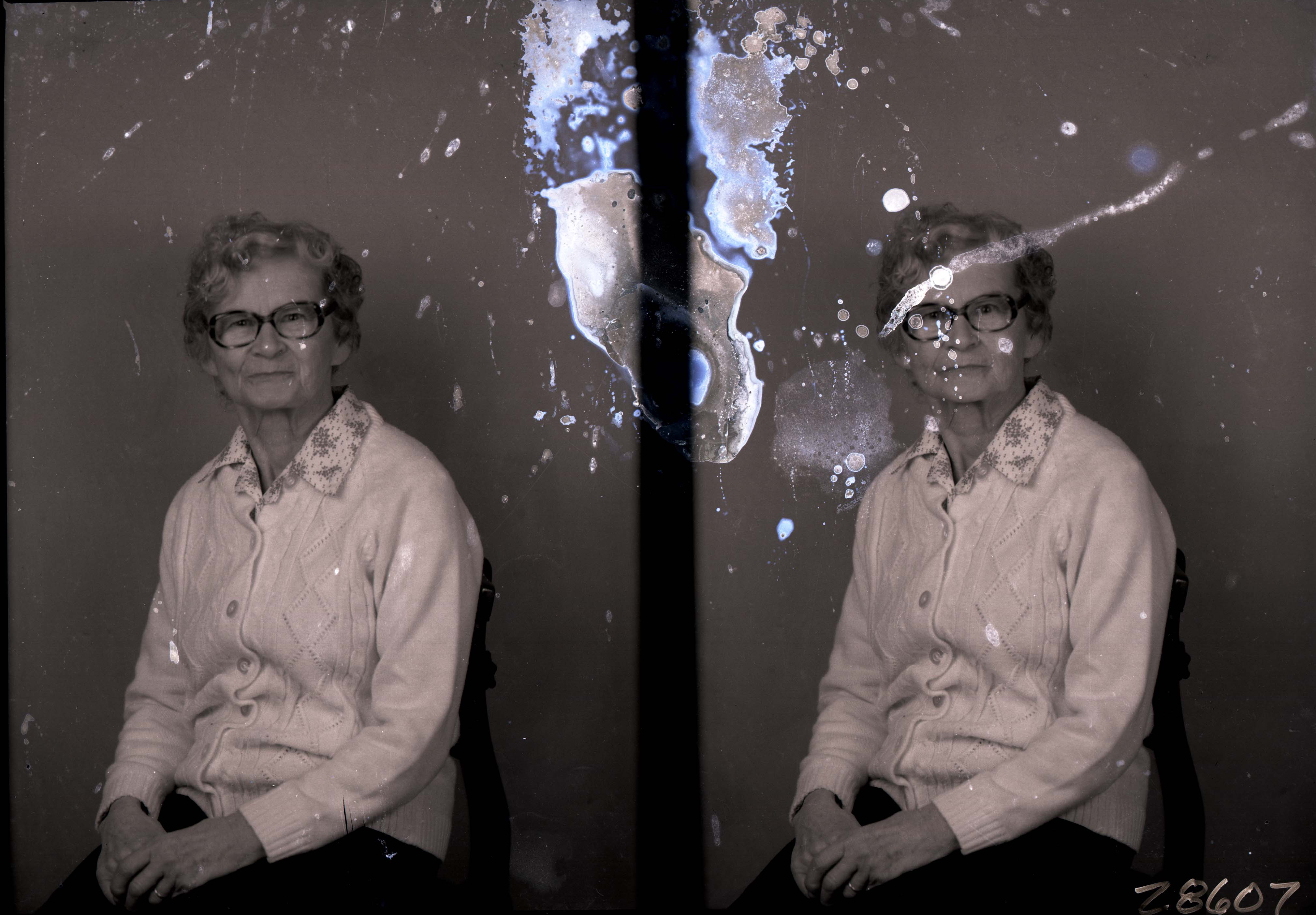 Photo of two separate photographs of the same unidentified older woman with short hair and glasses.