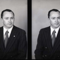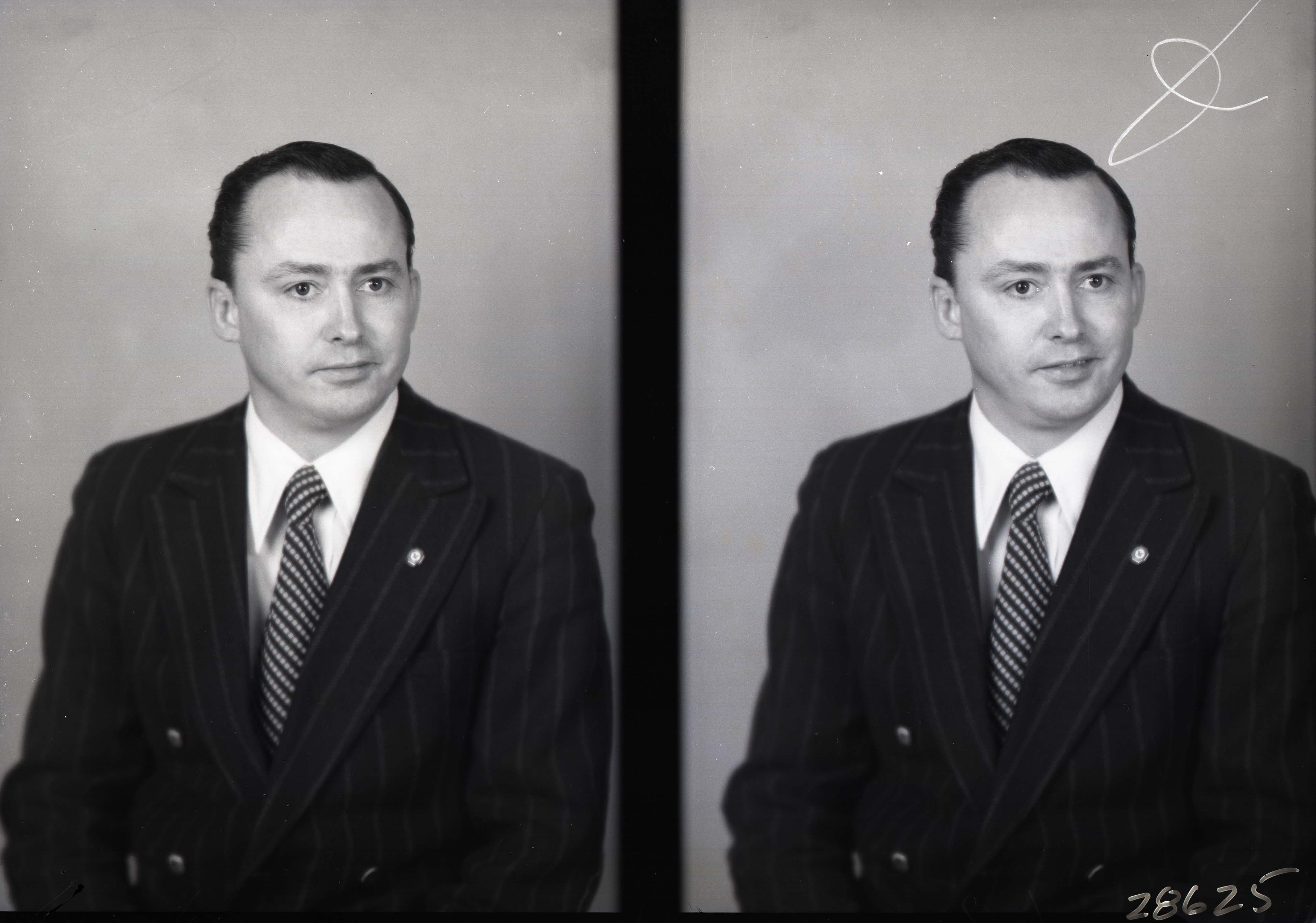 Photo of two separate portrait photographs of Dean Miller in a suit and tie.