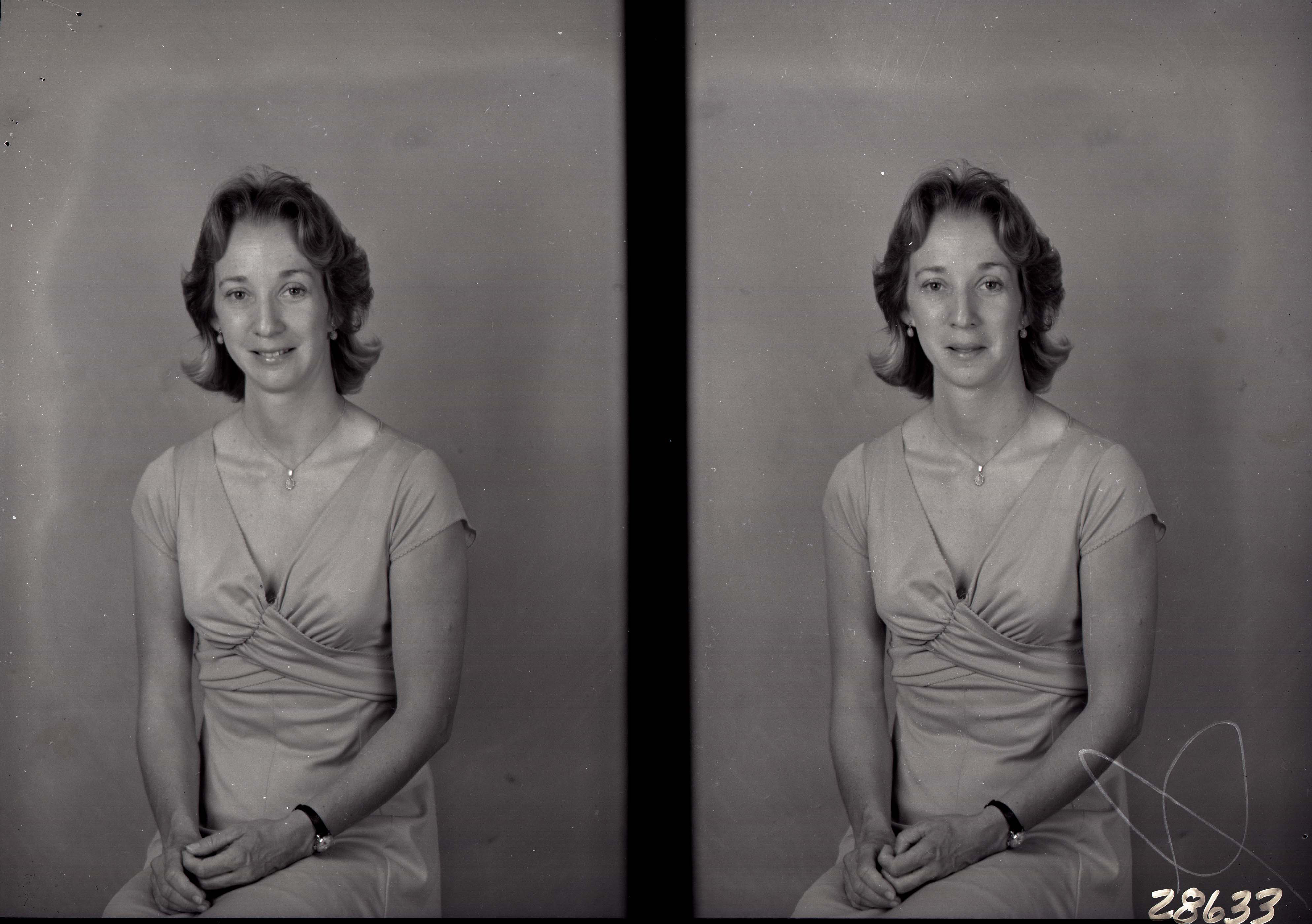 Photo of two separate photographs of the same, unidentified young woman with short hair and wearing a necklace with her short-sleeved dress.