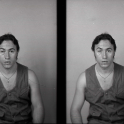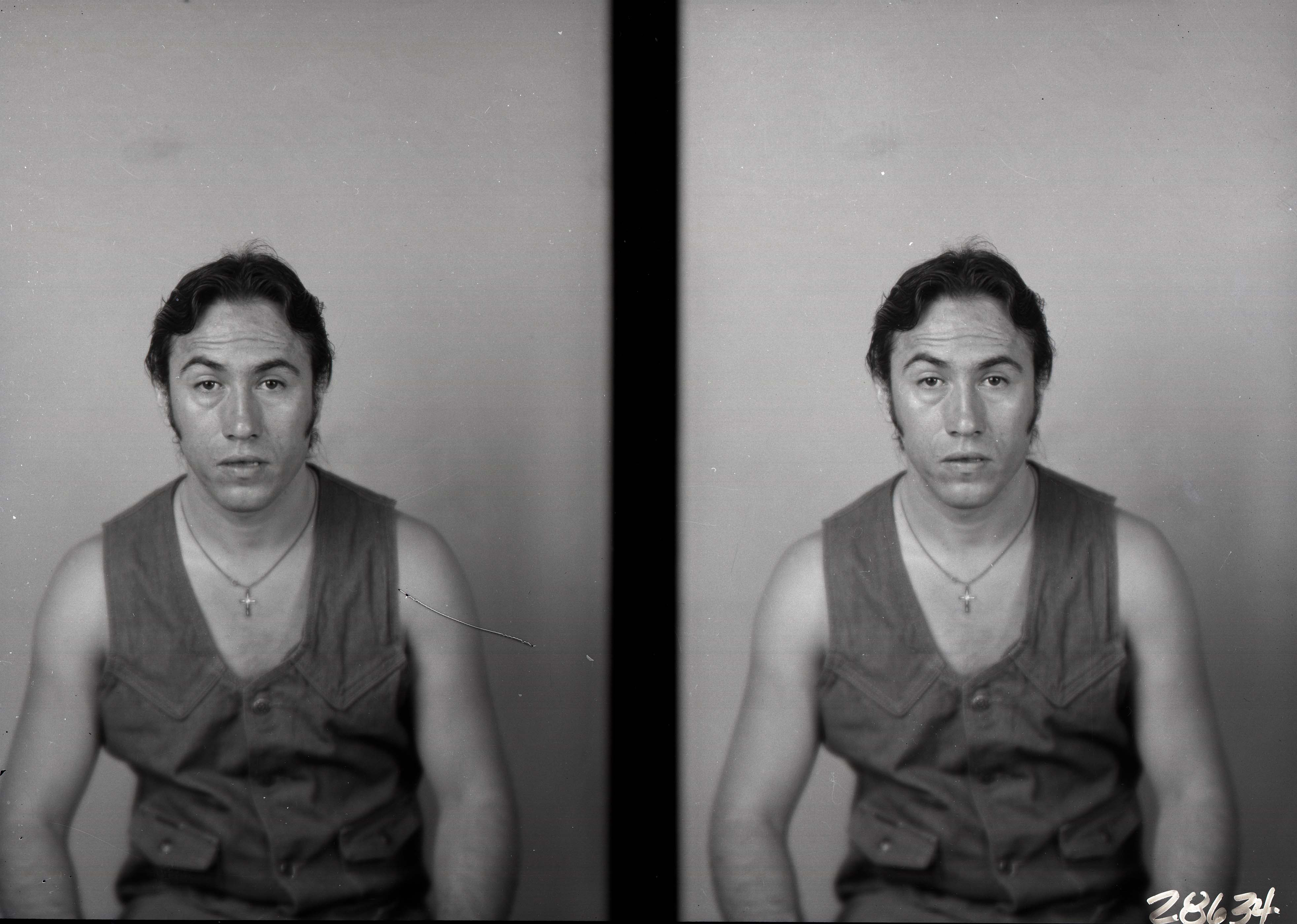Photo of two separate portrait photographs of the same, unidentified man with sideburns and wearing a necklace with his sleeveless shirt.