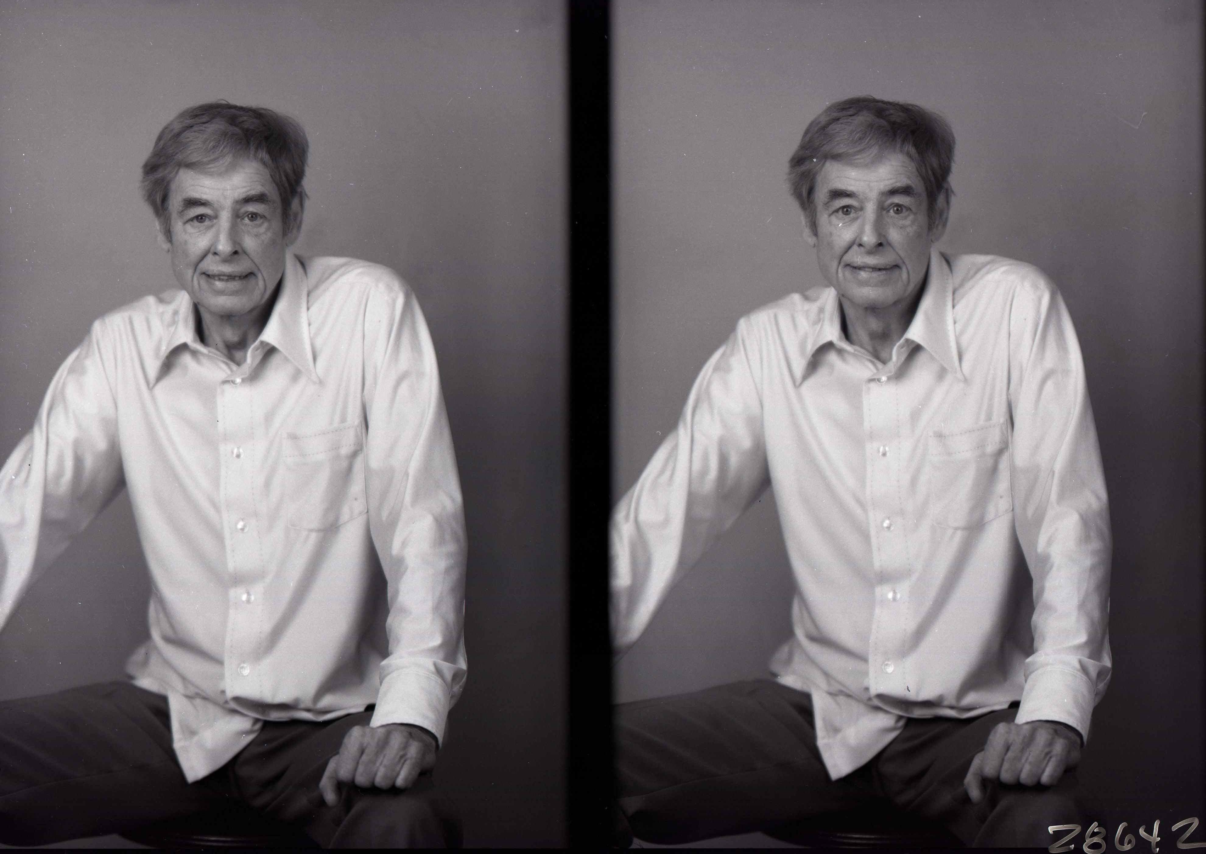 Photo of two separate photographs of the same unidentified man, seated, and wearing an untucked long-sleeved shirt.
