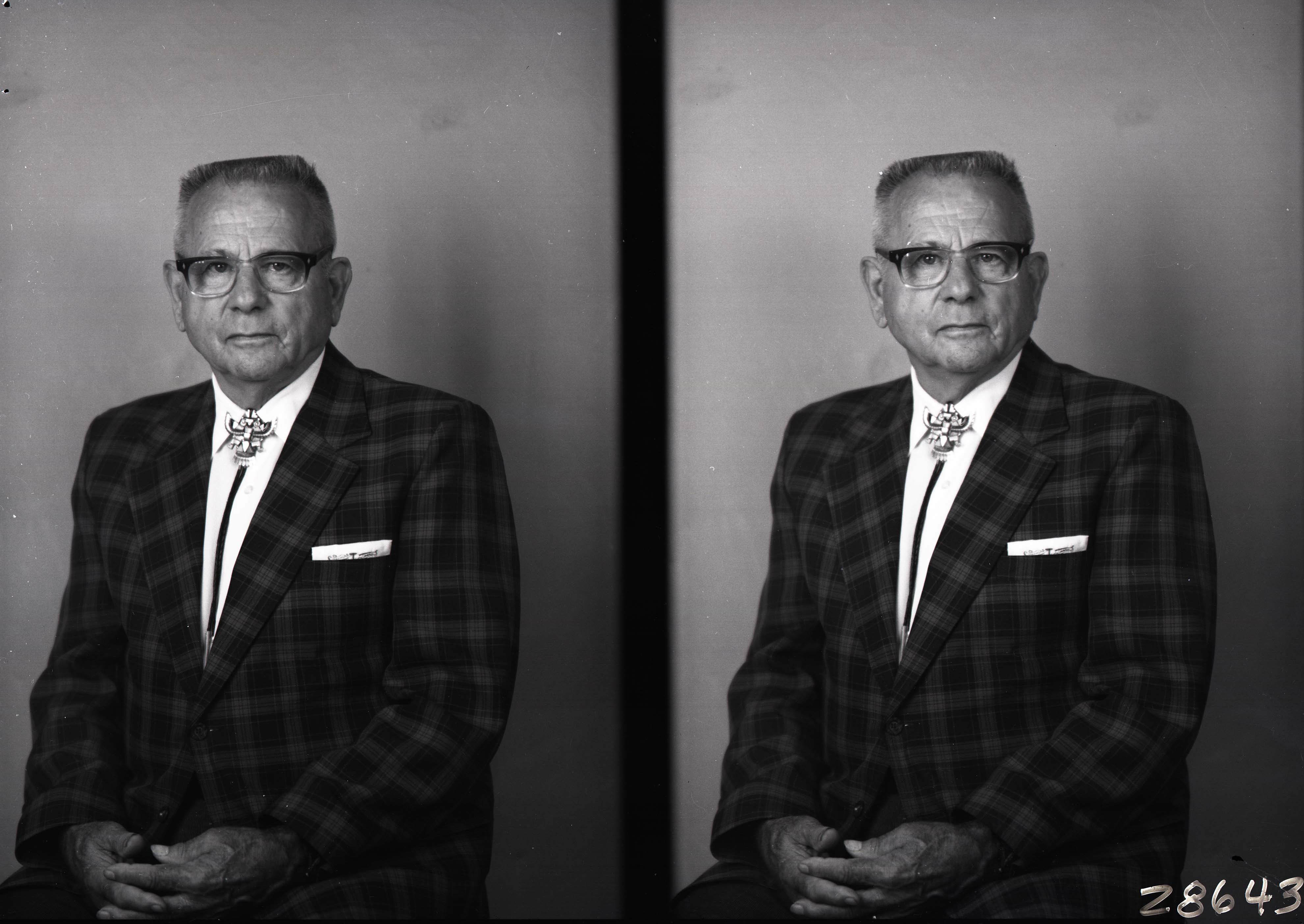 Photo of two separate portrait photographs of Ted Hockman with glasses, a crew cut, and wearing a plaid jacket and bolo.