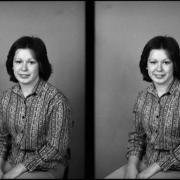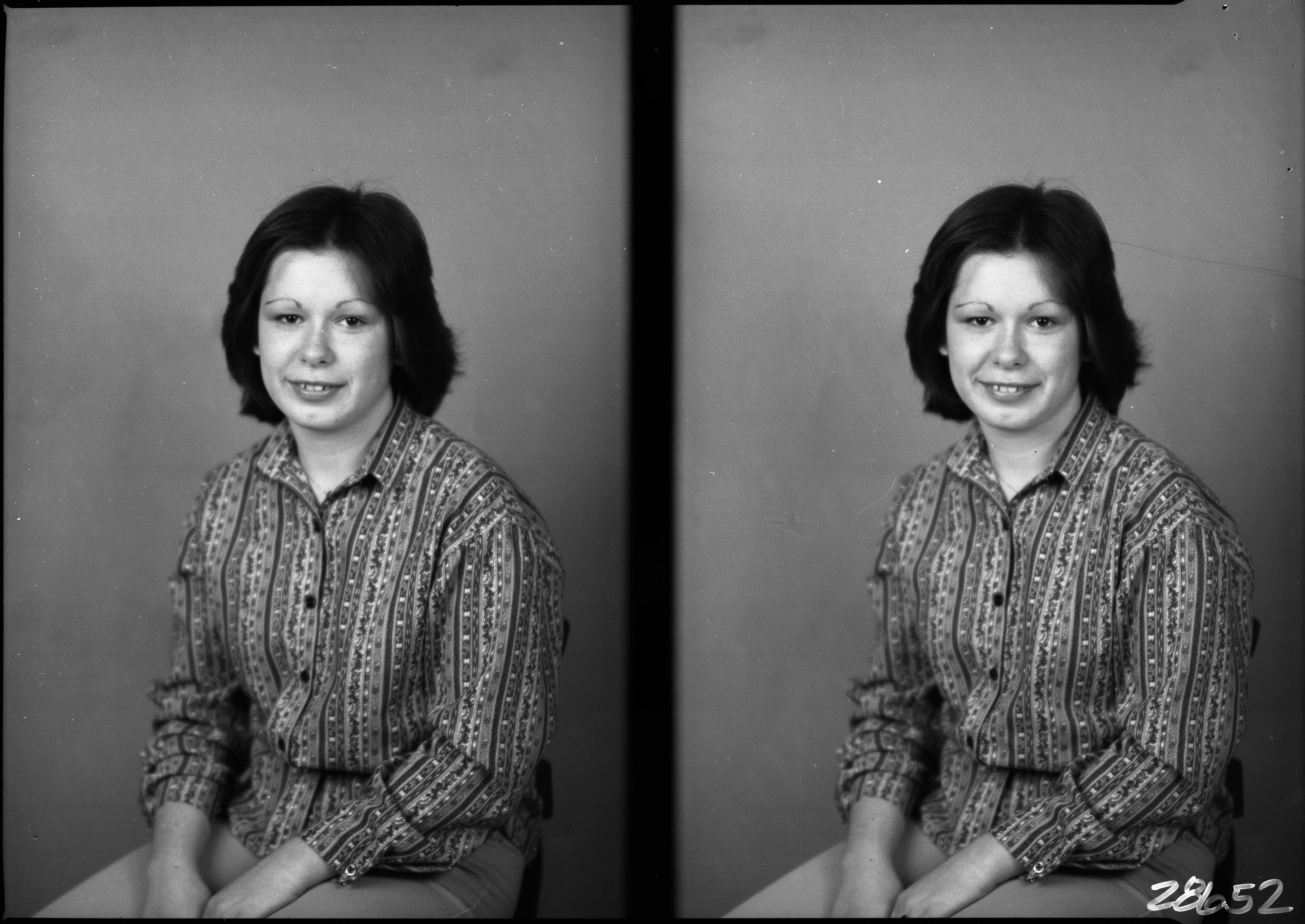 Photo of two separate photographs of the same unidentified young woman with short dark hair and wearing a print blouse.