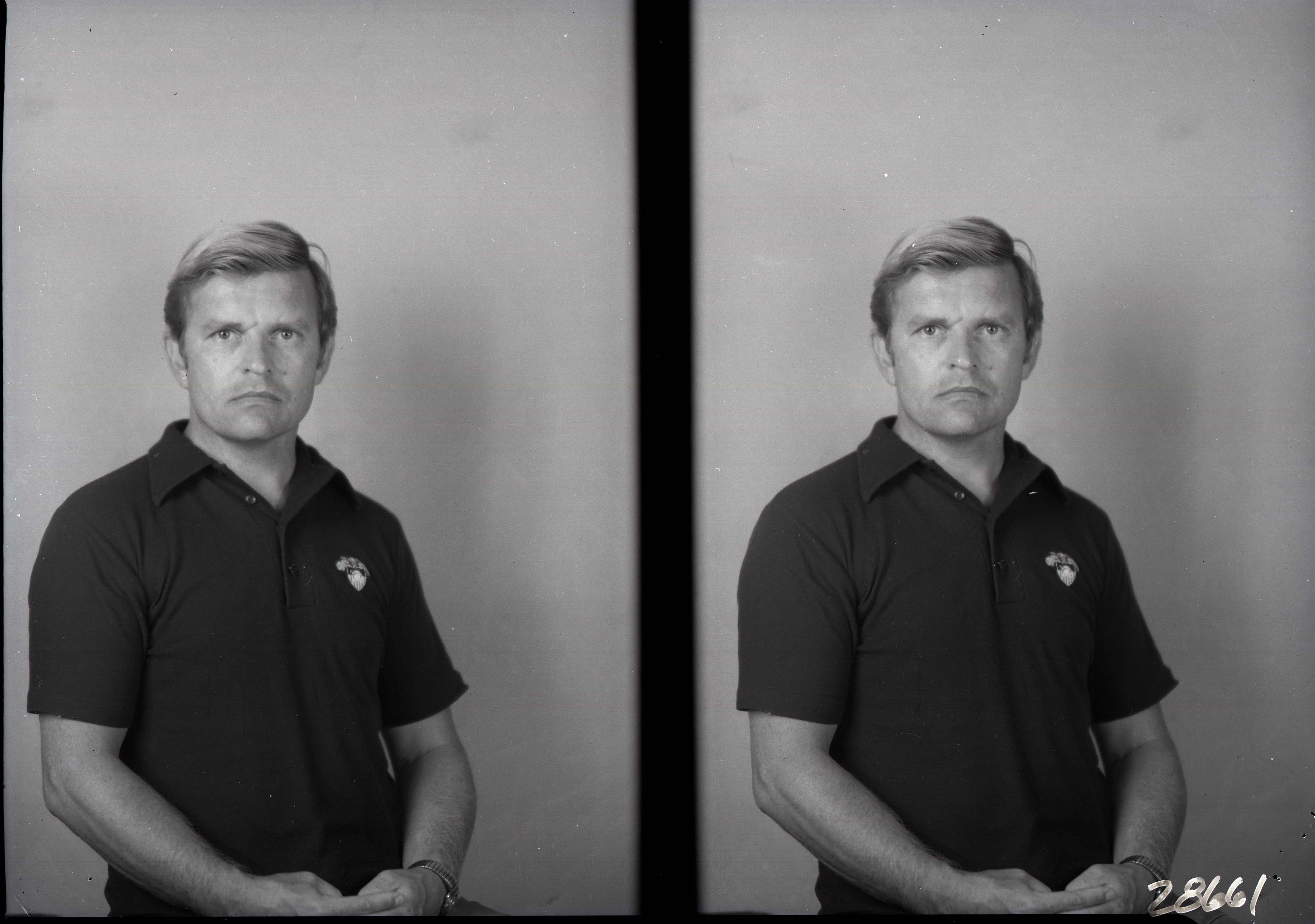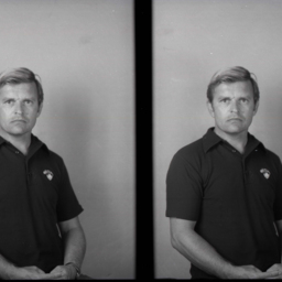 Photo of two separate portrait photographs of the same unidentified man in a short-sleeved, collared shirt.