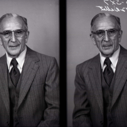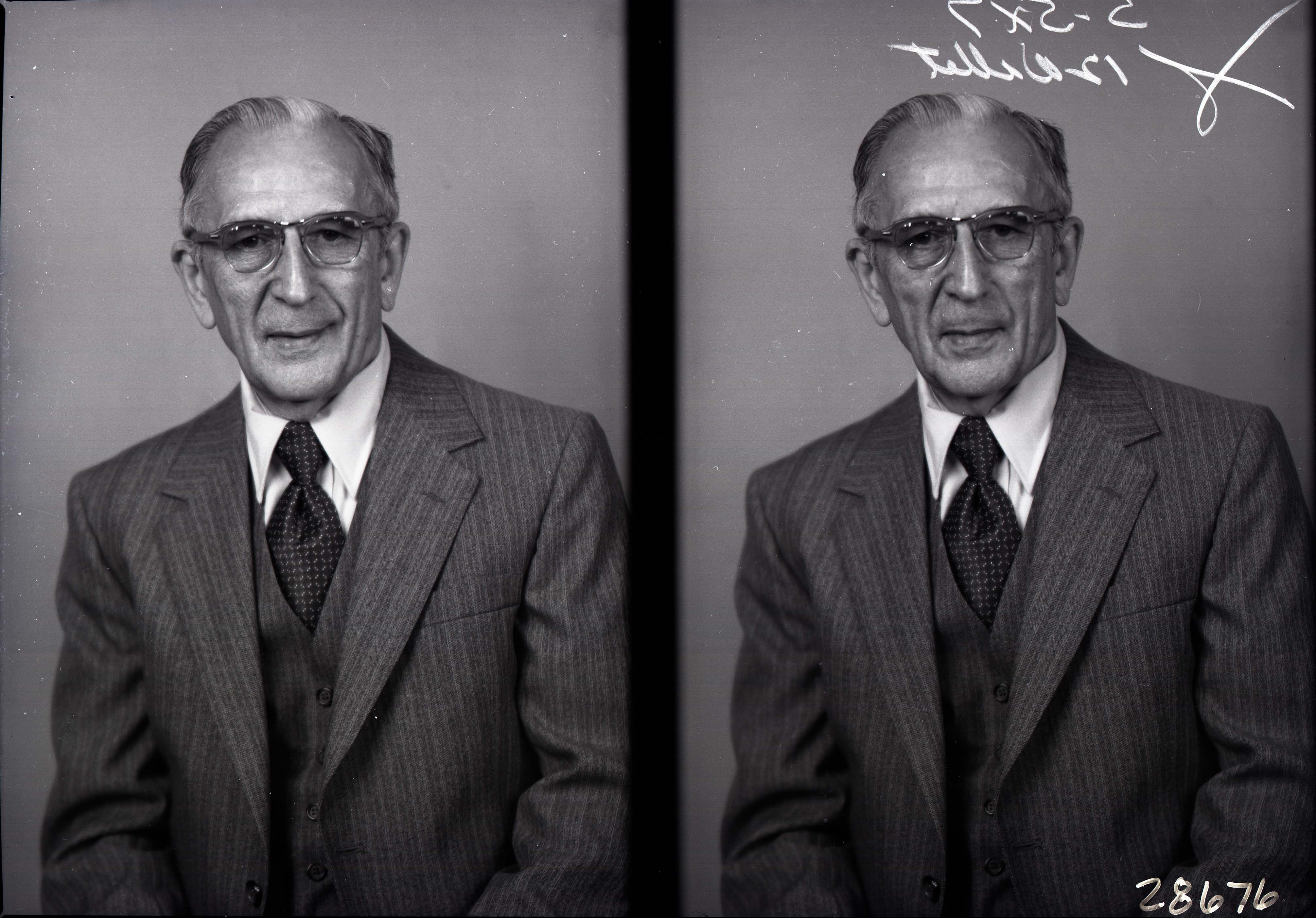Photo of two separate portrait photographs of the same unidentified older man with glasses. He is wearing a striped suit and tie.