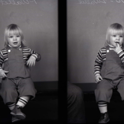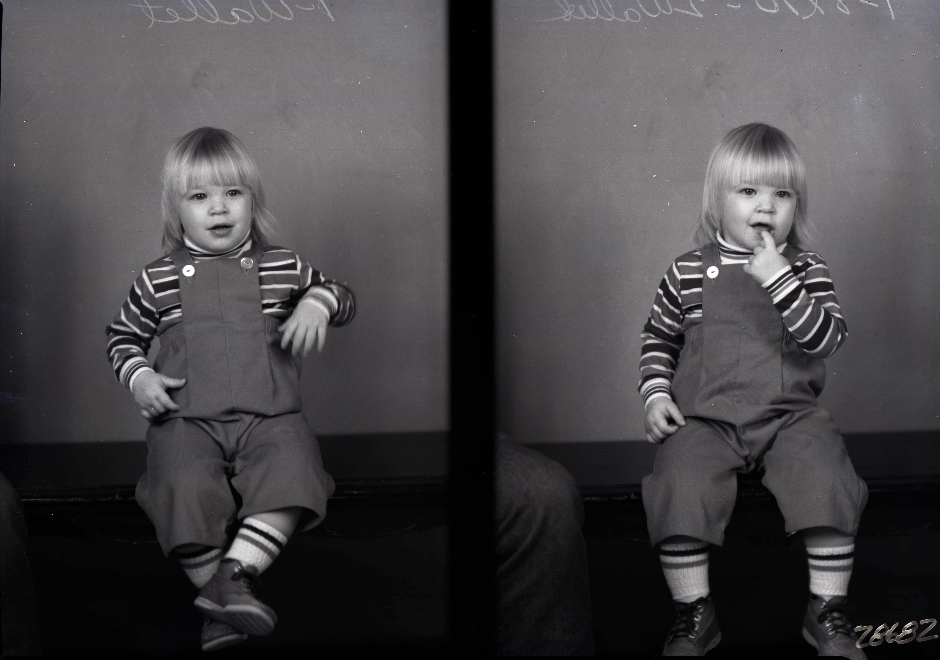 Photo of two separate photographs of the same unidentified young blond child wearing a striped shirt and overalls.