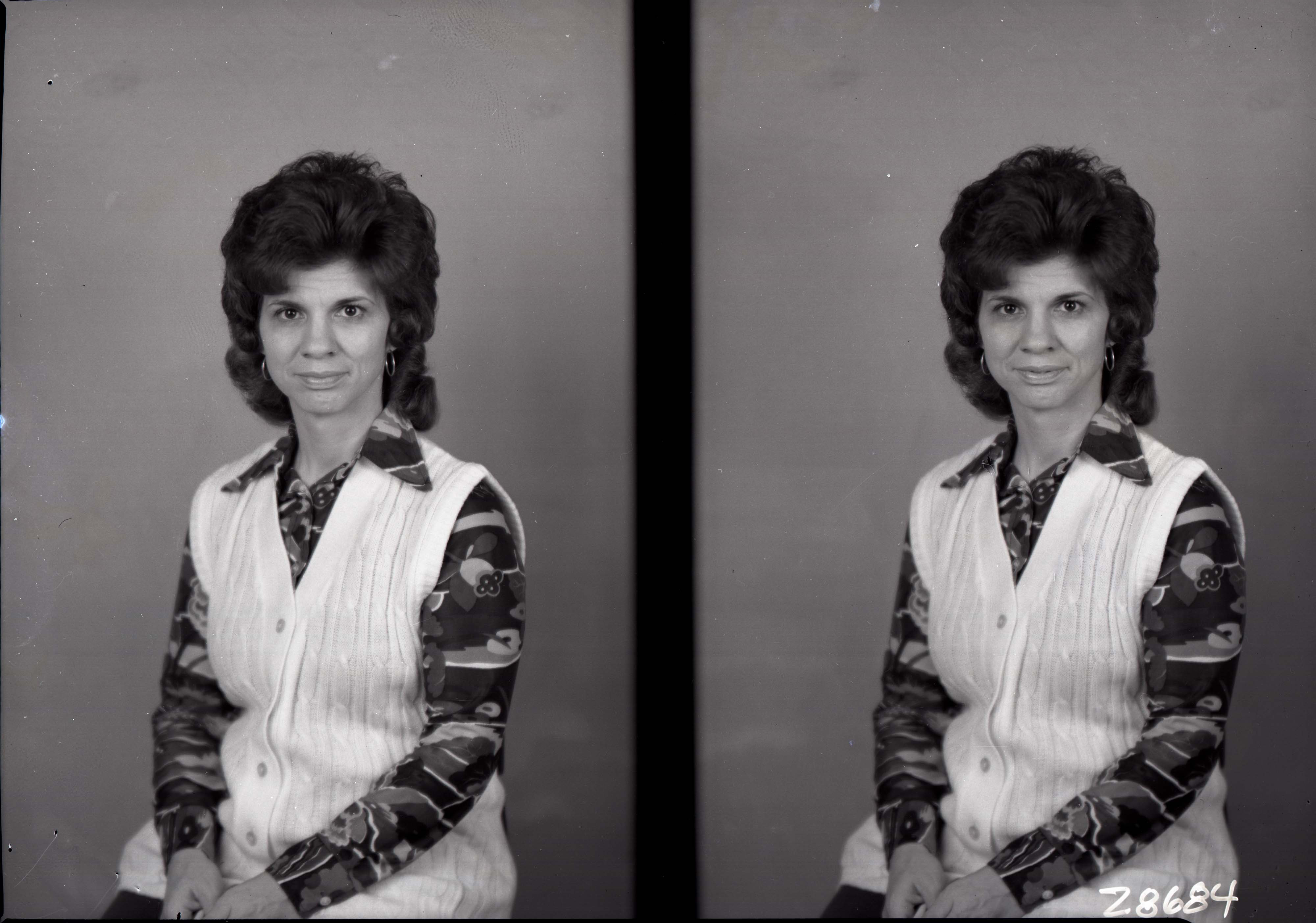 Photo of two separate portrait photographs of Judy Ann (Duncan) Kibler with short, styled hair and wearing a sweater vest with her print top.