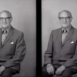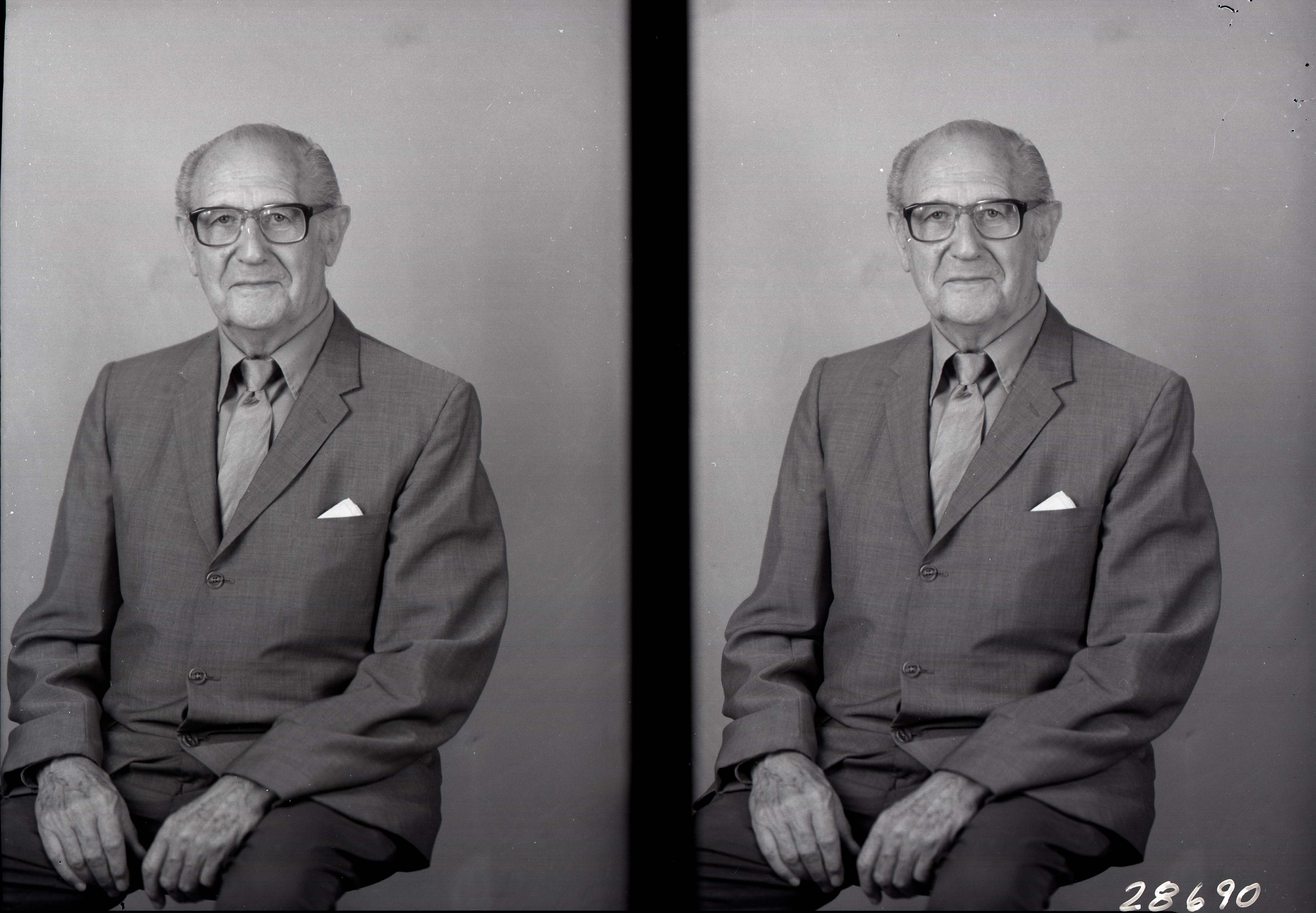 Photo of two separate photographs of the same unidentified man with glasses and wearing a suit and tie. Part of a handkerchief is visible in his breast pocket.