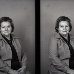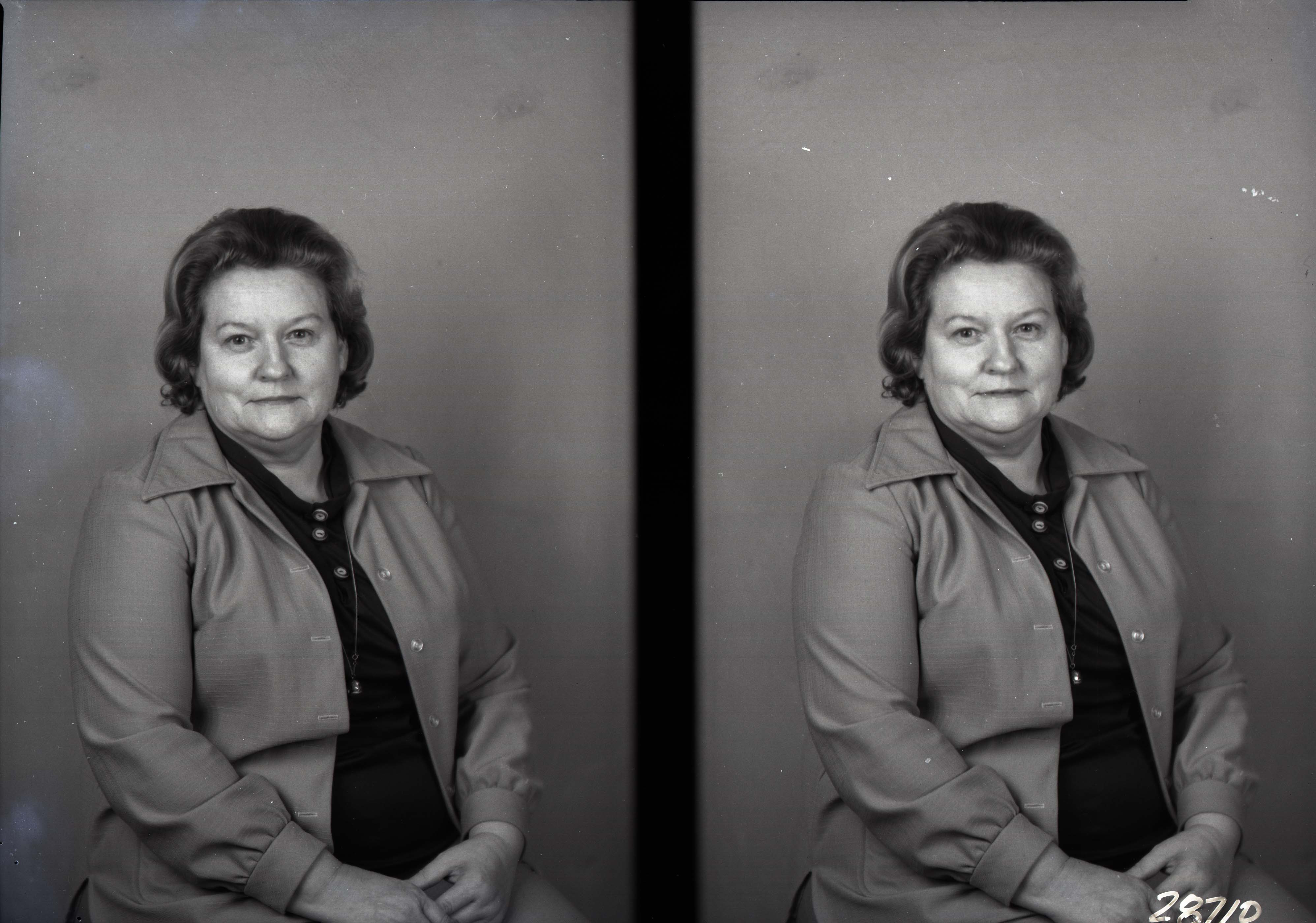 Photo of two separate portrait photographs of the same unidentified woman with short hair.