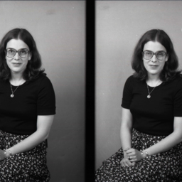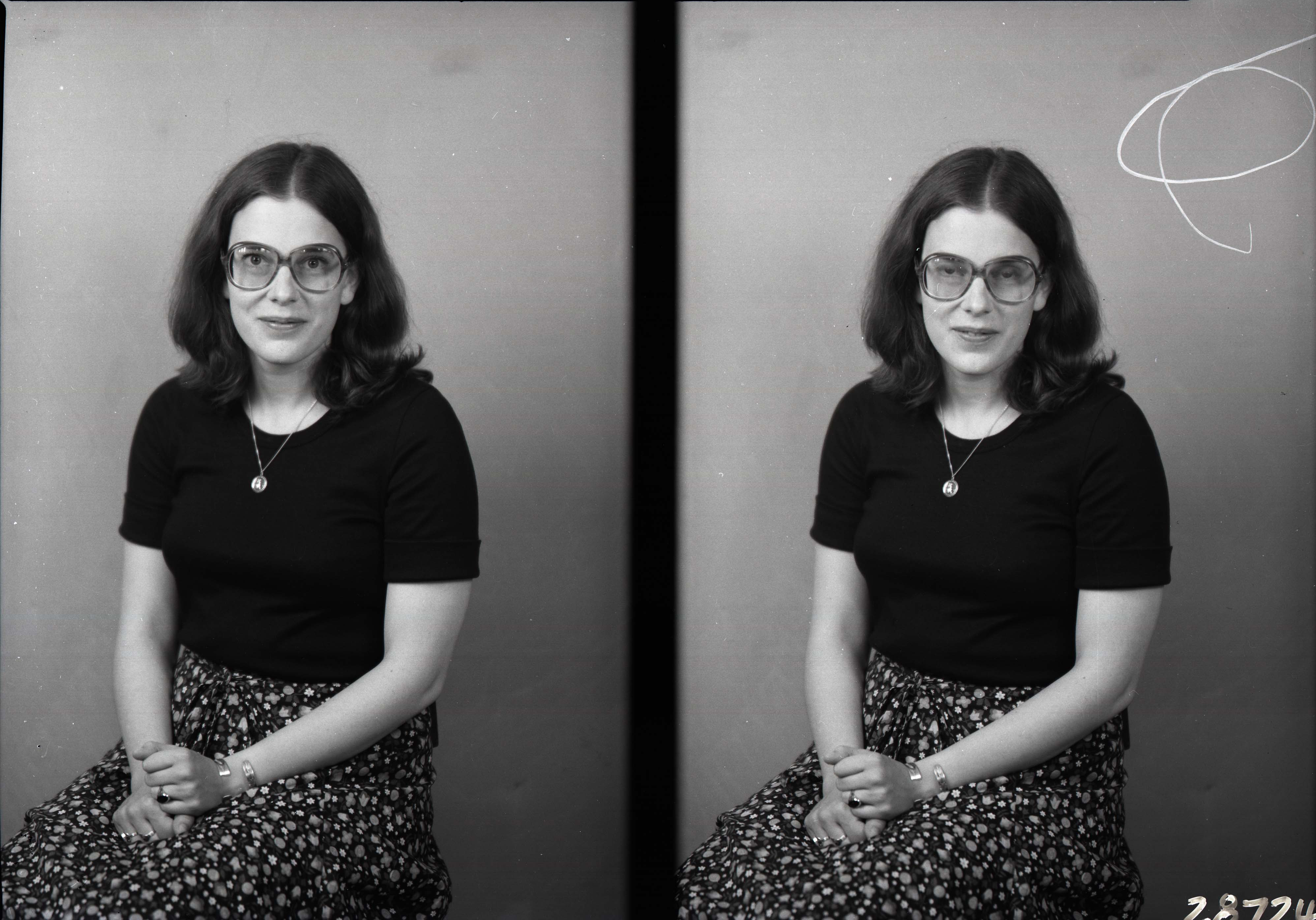 Photo of two separate photographs of the same unidentified woman with shoulder-length hair parted in the middle and wearing glasses and a necklace with her print skirt and short-sleeved shirt.