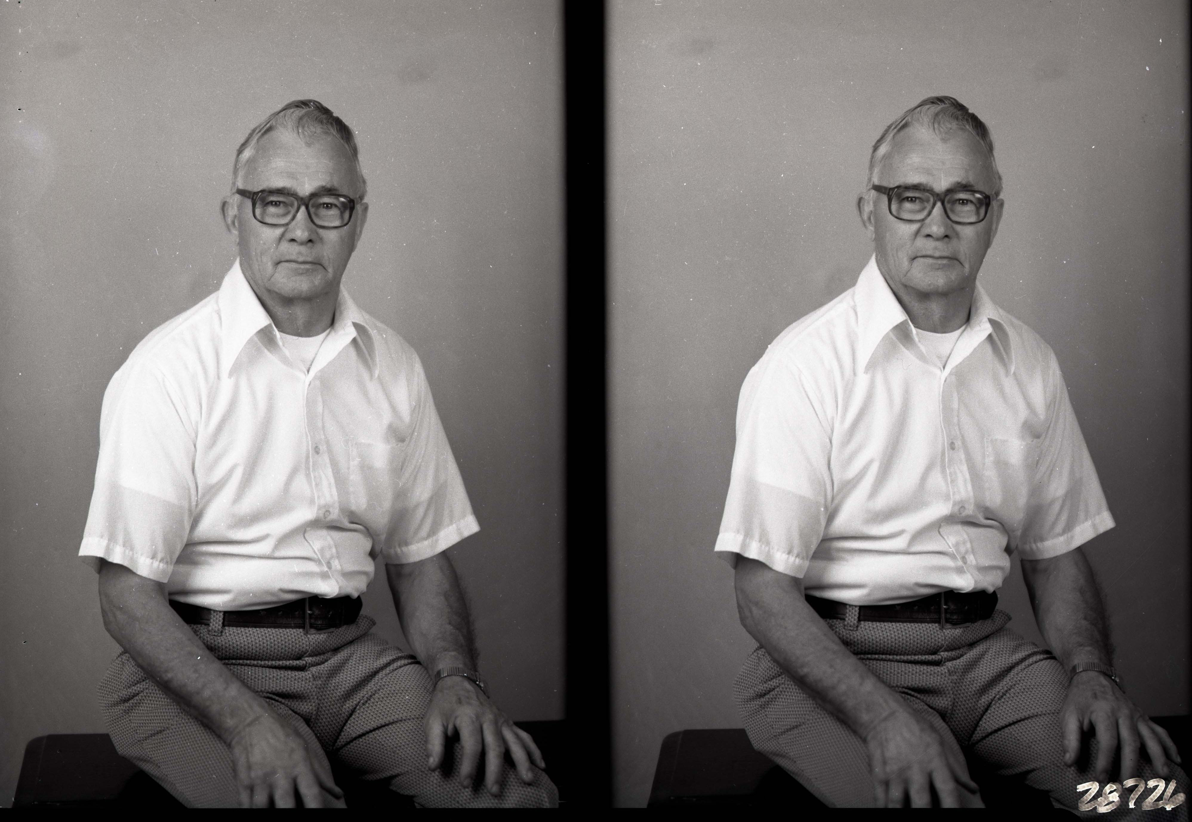 Photo of two separate photographs of Stanley Day with glasses and seated.