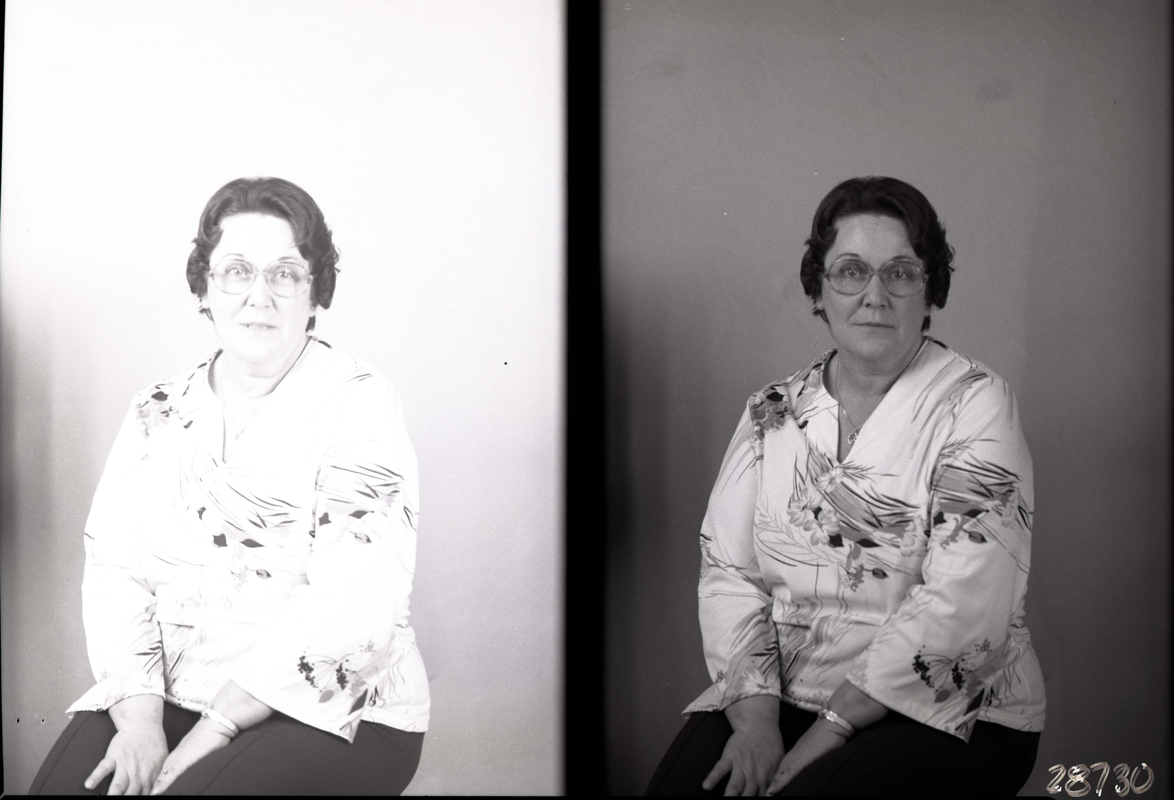 Photo of two separate photographs of Donna Dellinger with short hair and glasses.