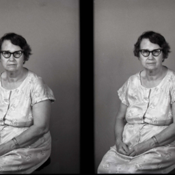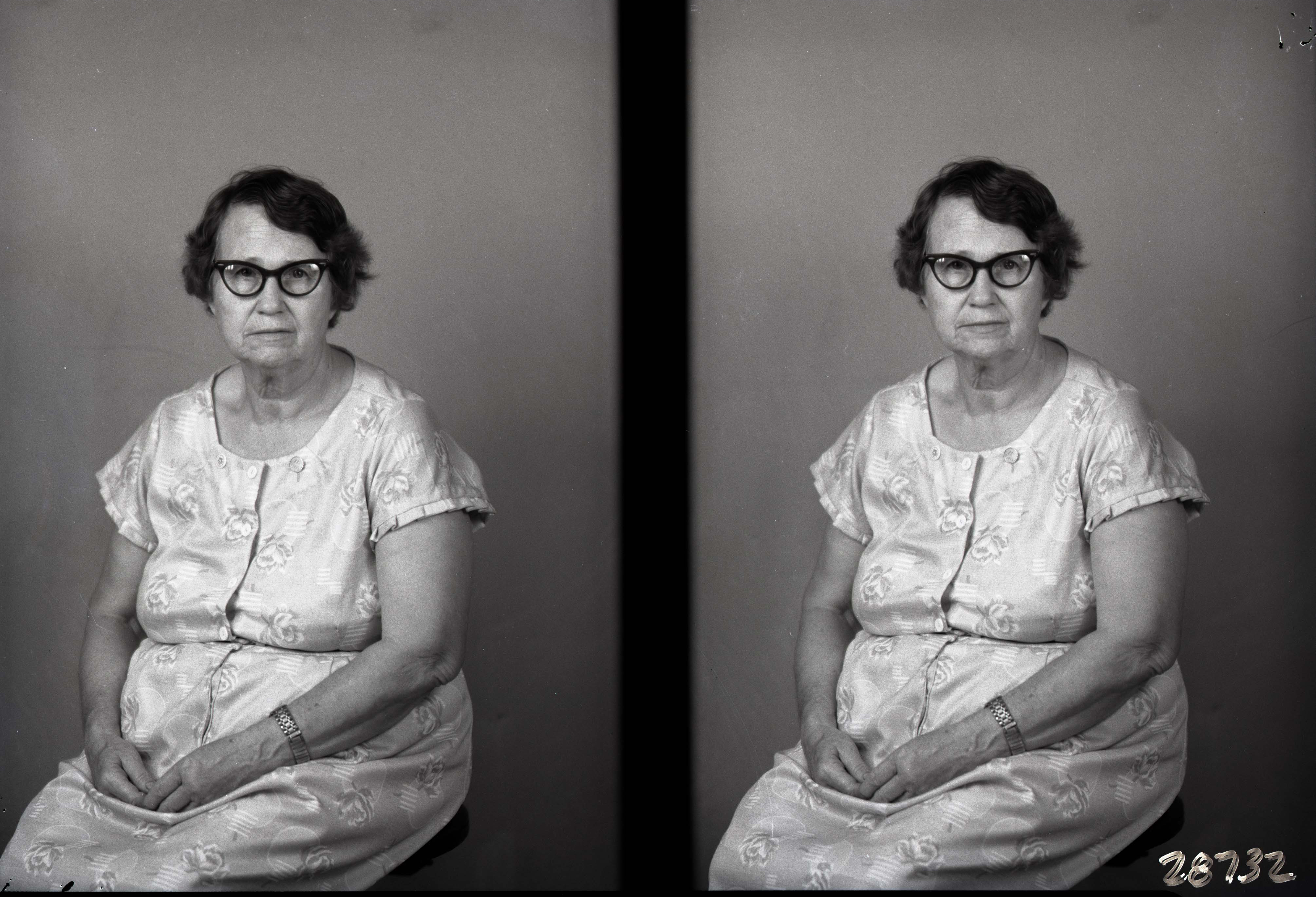 Photo of two separate photographs of the same unidentified woman with short hair and glasses. She is seated with her hands in her lap.