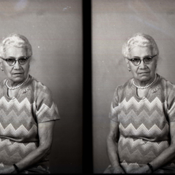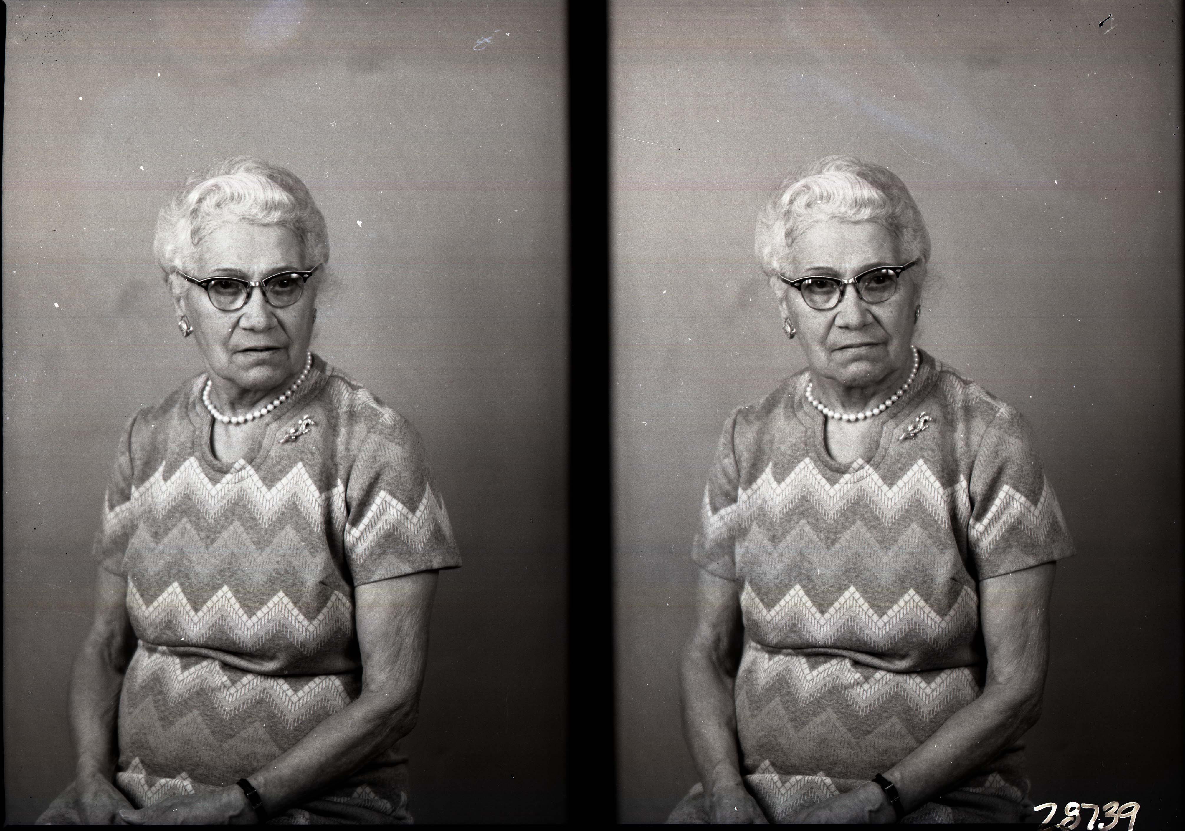 Photo of two separate photographs of the same unidentified woman with short hair, glasses, a necklace, and a pin being worn with a print, short-sleeved dress.