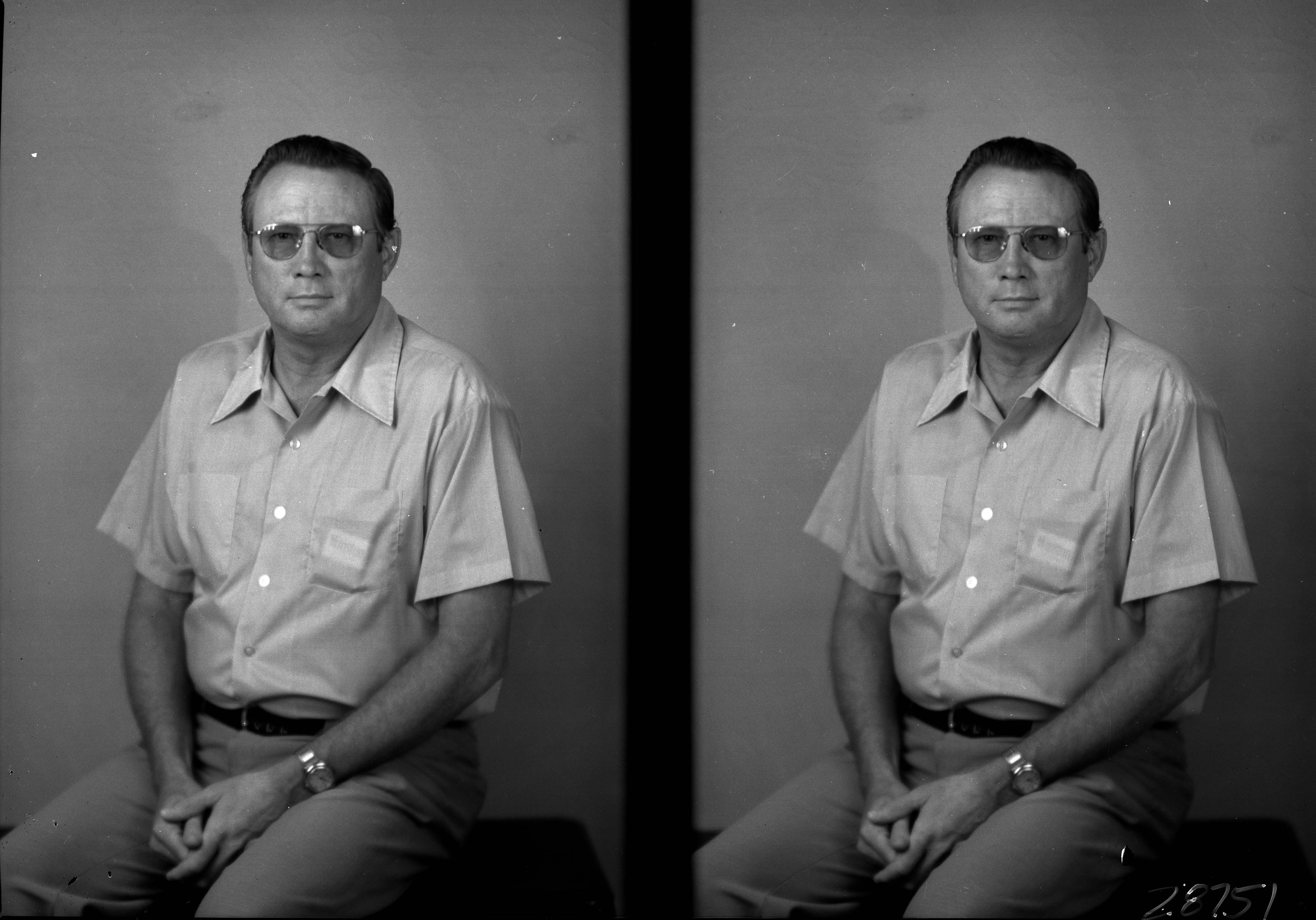 Photo of two separate photographs of the same unidentified man with glasses. He is seated with his hands in his lap.