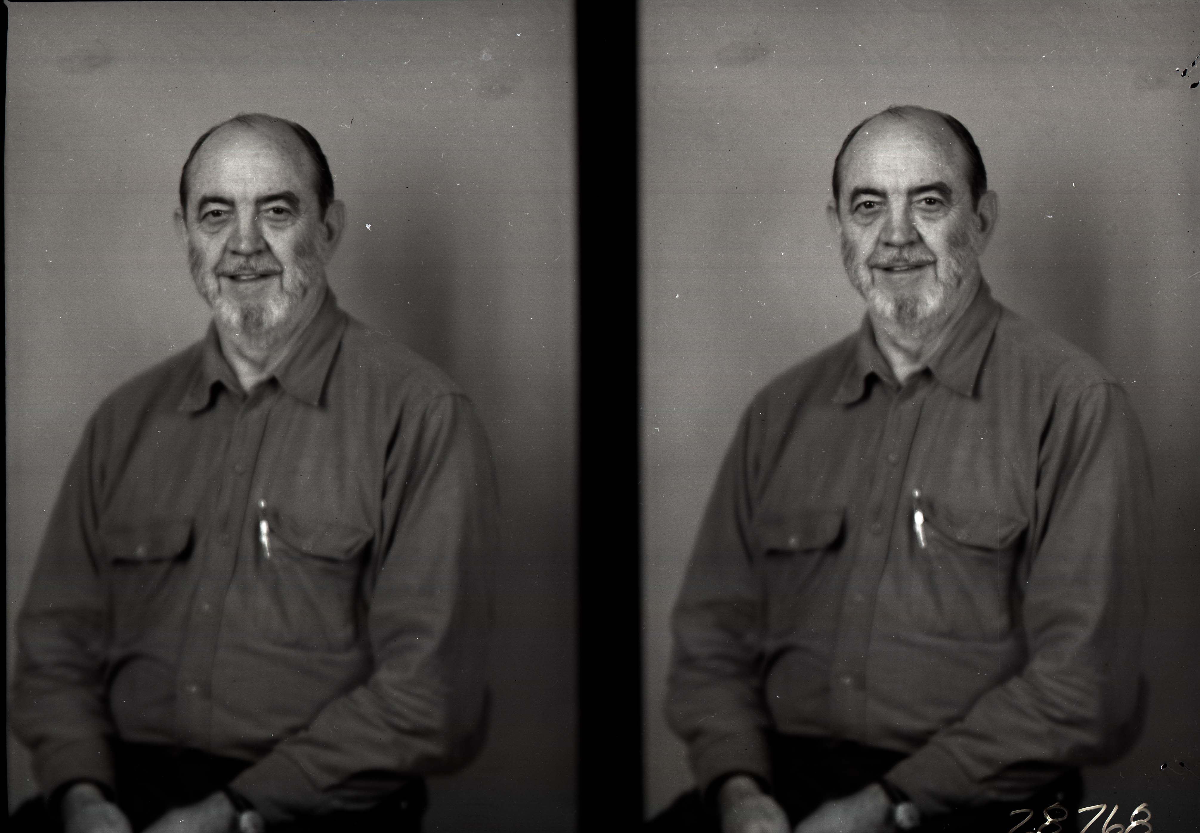 Photo of two separate portrait photographs of the same unidentified man with a beard and mustache. He is wearing a long-sleeved shirt with a pen sticking out of the breast pocket.