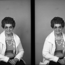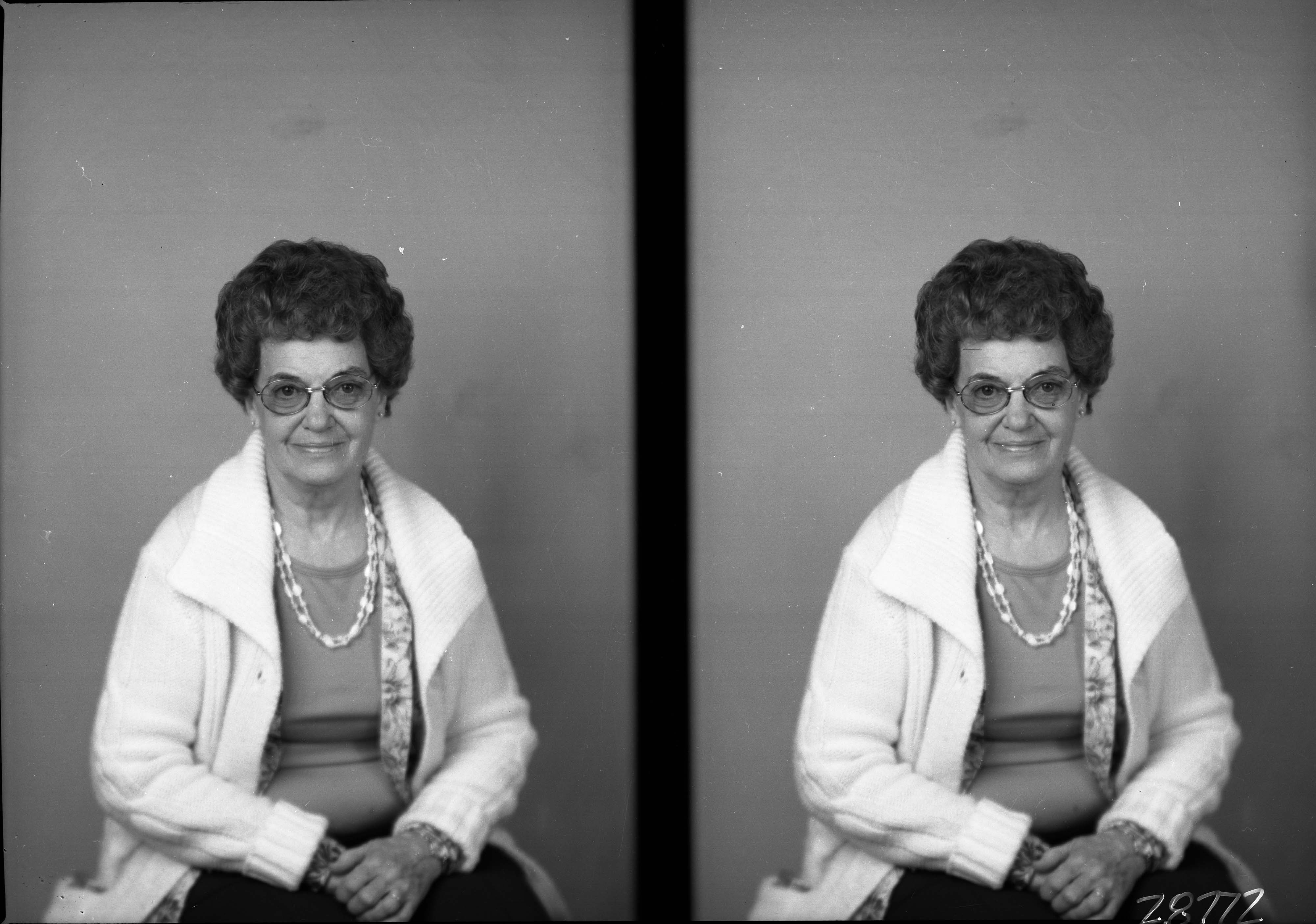 Photo of two separate portrait photographs of the same unidentified woman with glasses and short, styled hair wearing a sweater with buttons and a bead necklace with her outfit.