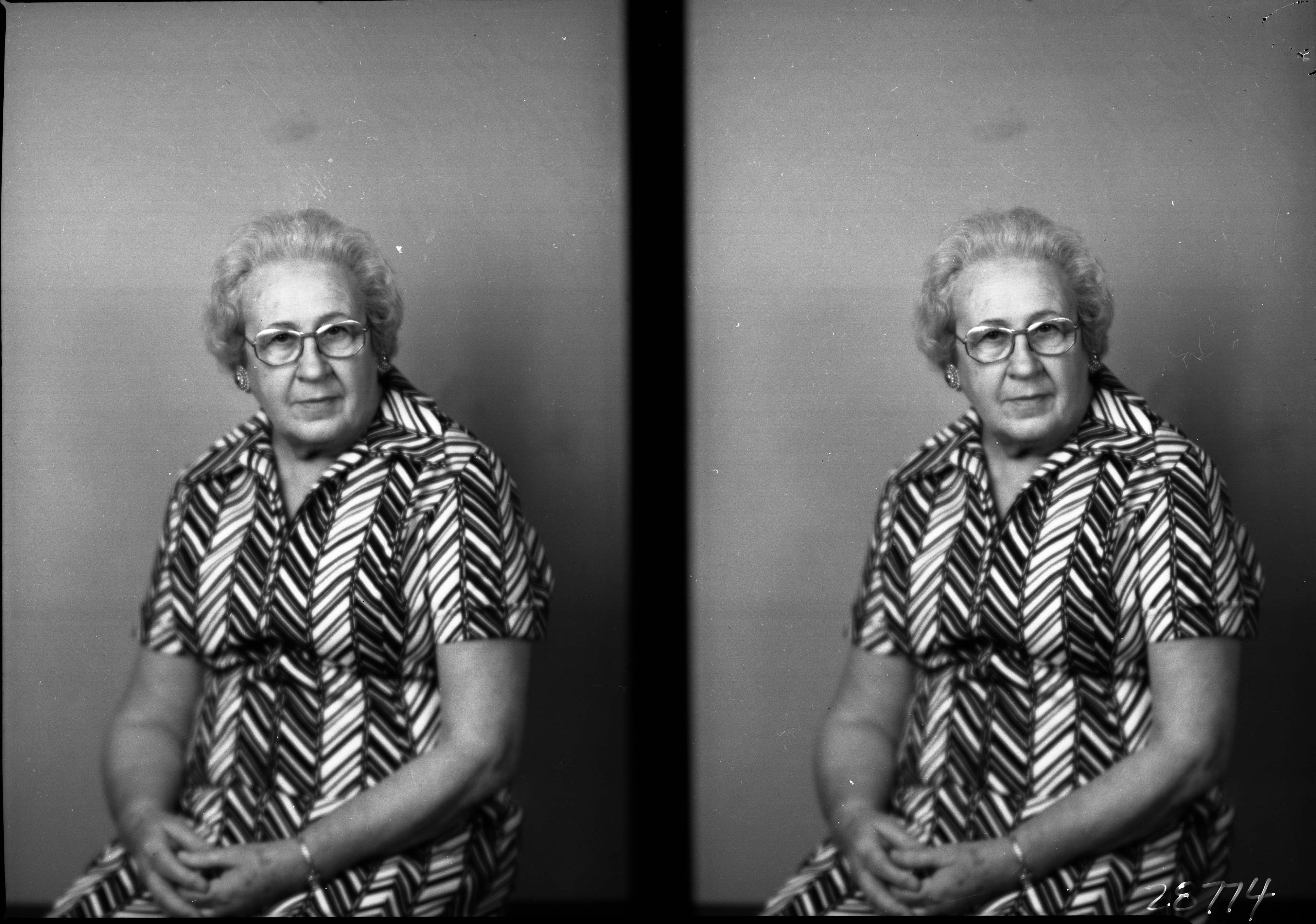 Photo of two photographs of Elizabeth (Thompson) Everly of Mt. Jackson, with glasses, and wearing a patterned, short-sleeved, dress.