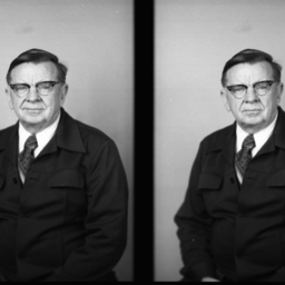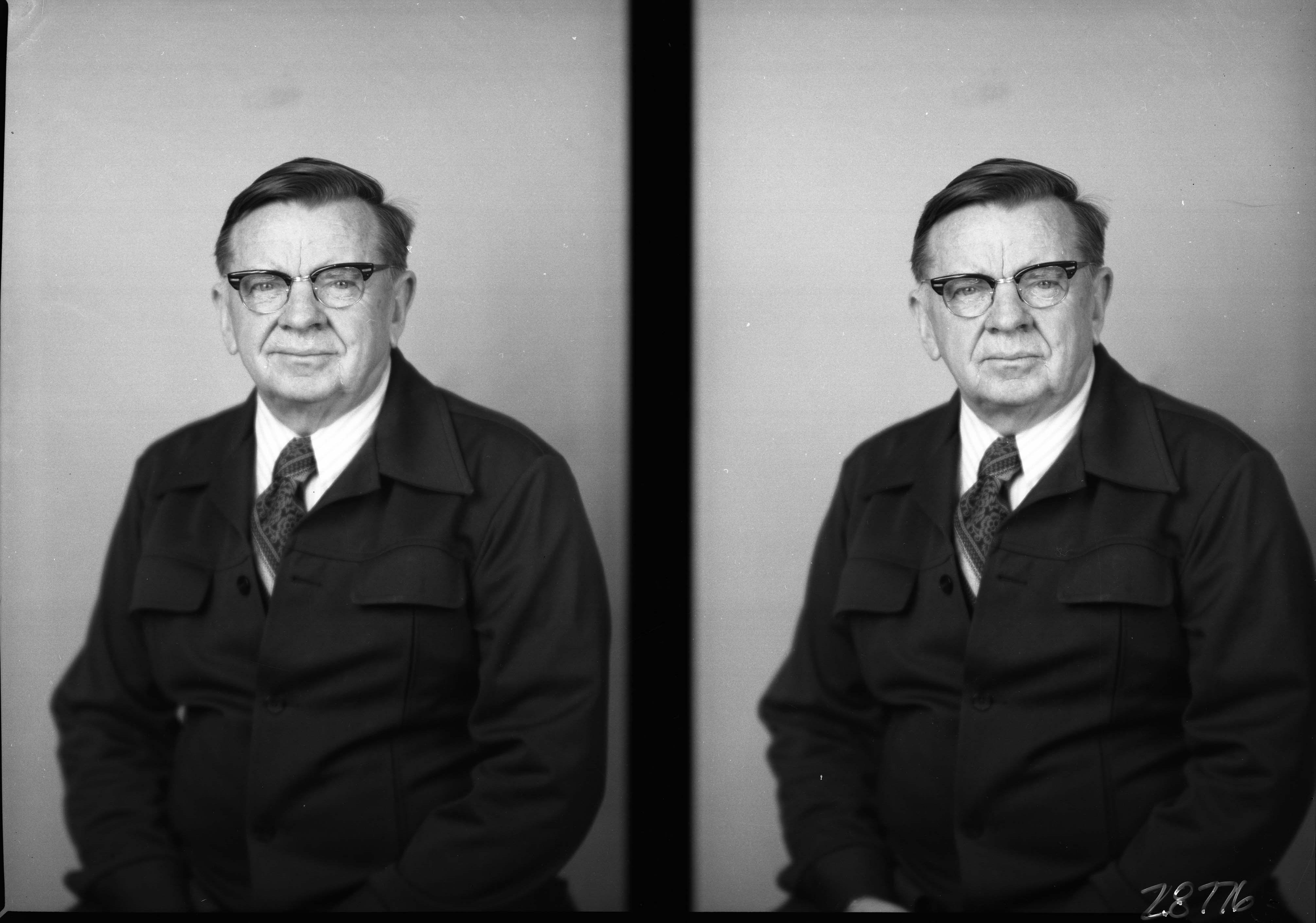 Photo of two separate portrait photographs of the same unidentified man wearing glasses and a suit and tie.