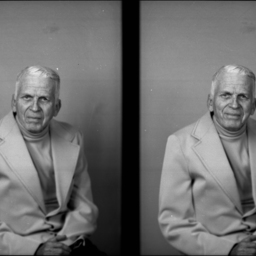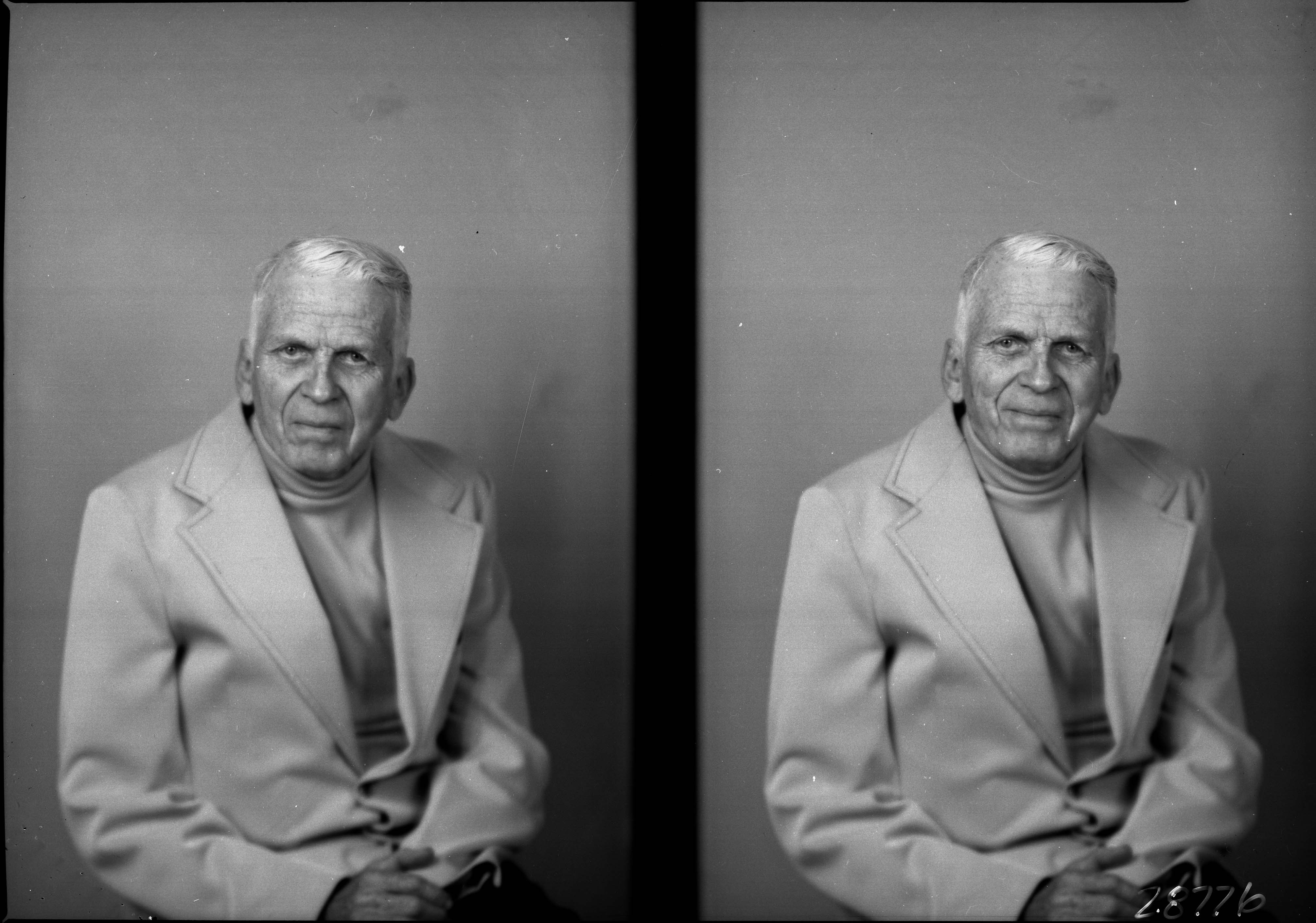 Photo of two separate portrait photographs of the same older unidentified man wearing a suit jacket with a turtleneck shirt.