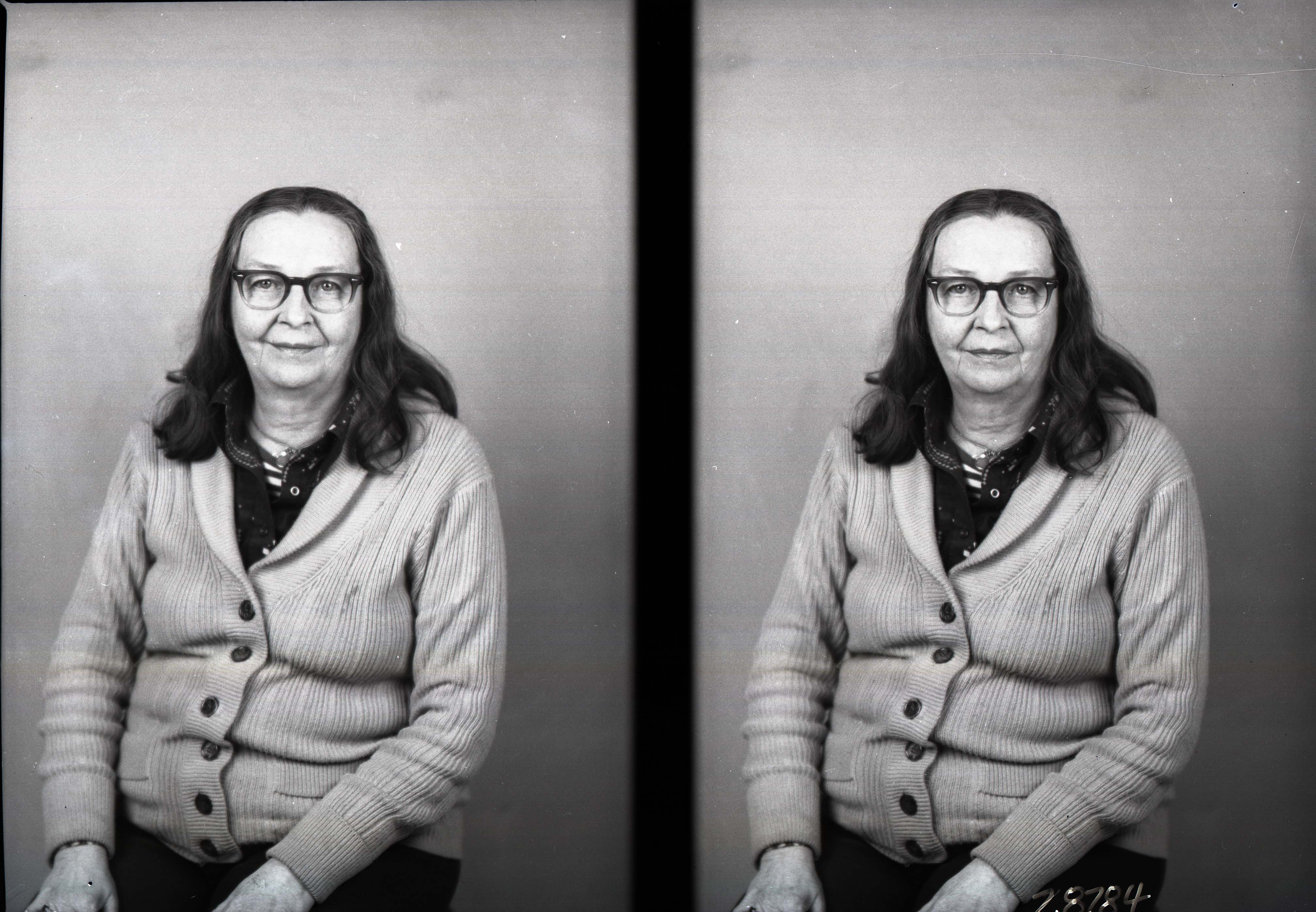 Photo of two separate portrait photographs of the same unidentified woman with long, straight hair and glasses.
