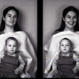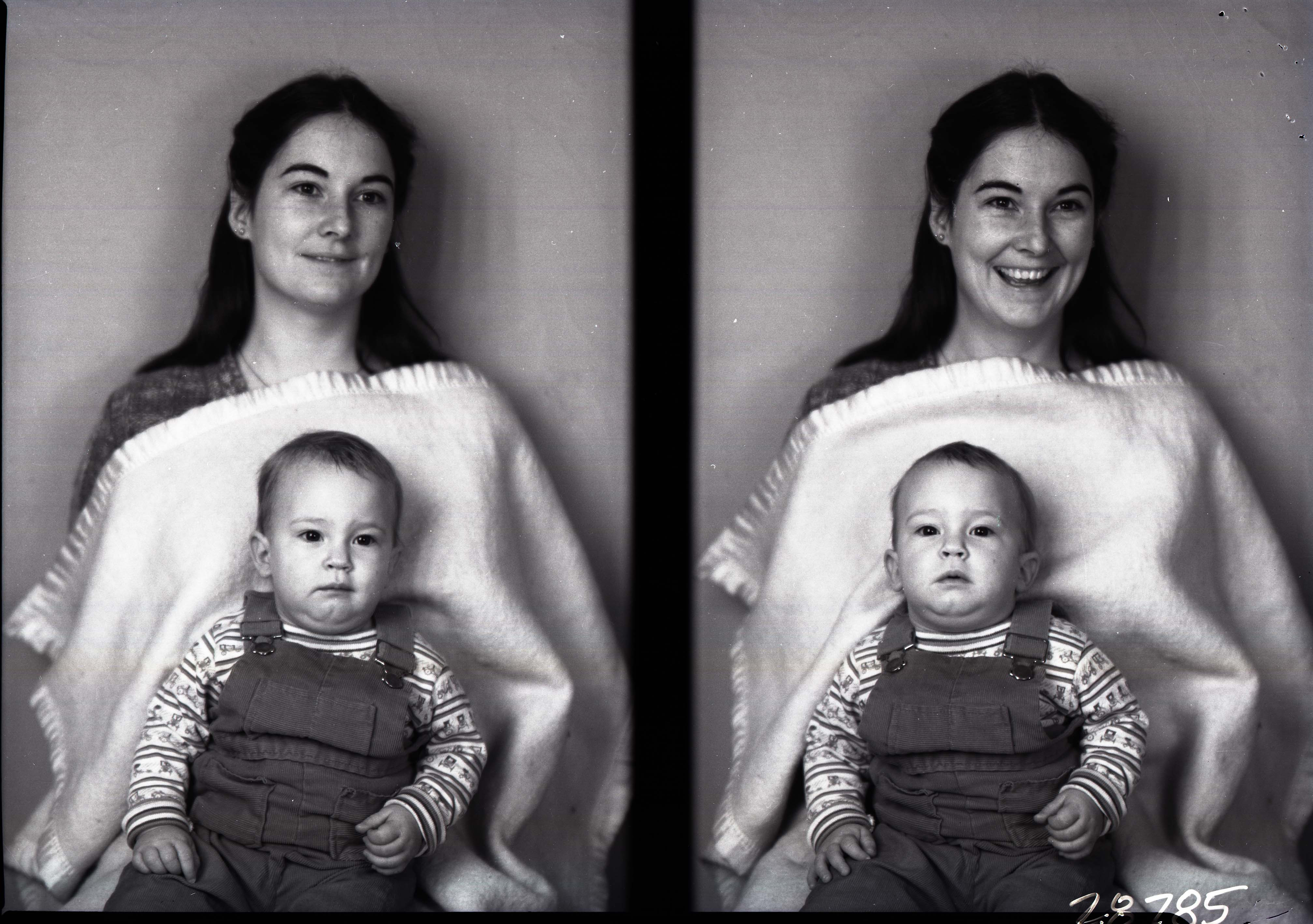Photo of two separate photographs of an unidentified young woman with long hair holding a toddler in overalls on her lap.
