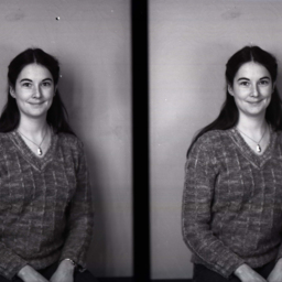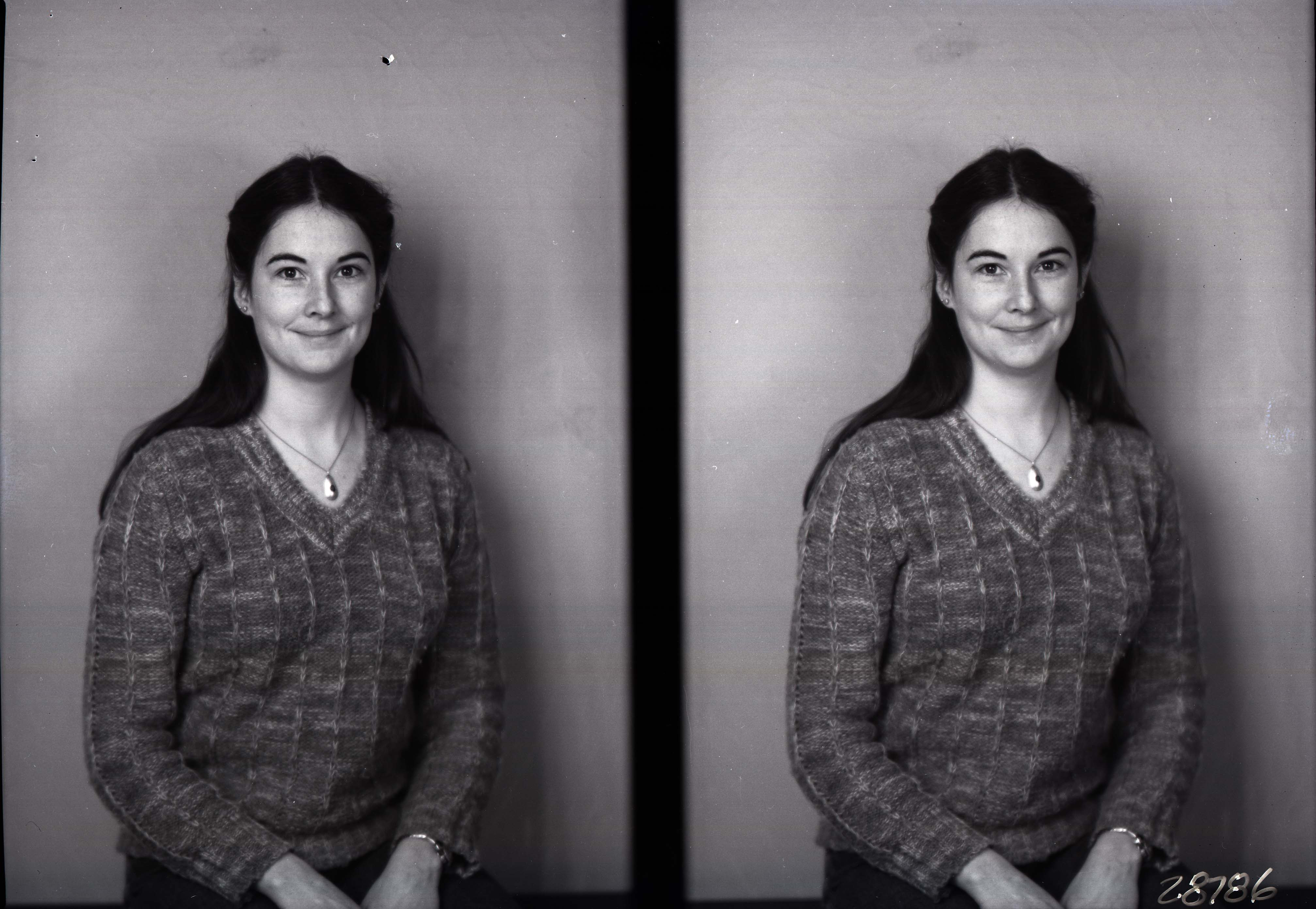 Photo of two separate portrait photographs of the same unidentified young woman with long dark hair and wearing a necklace with her sweater.