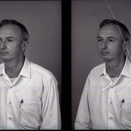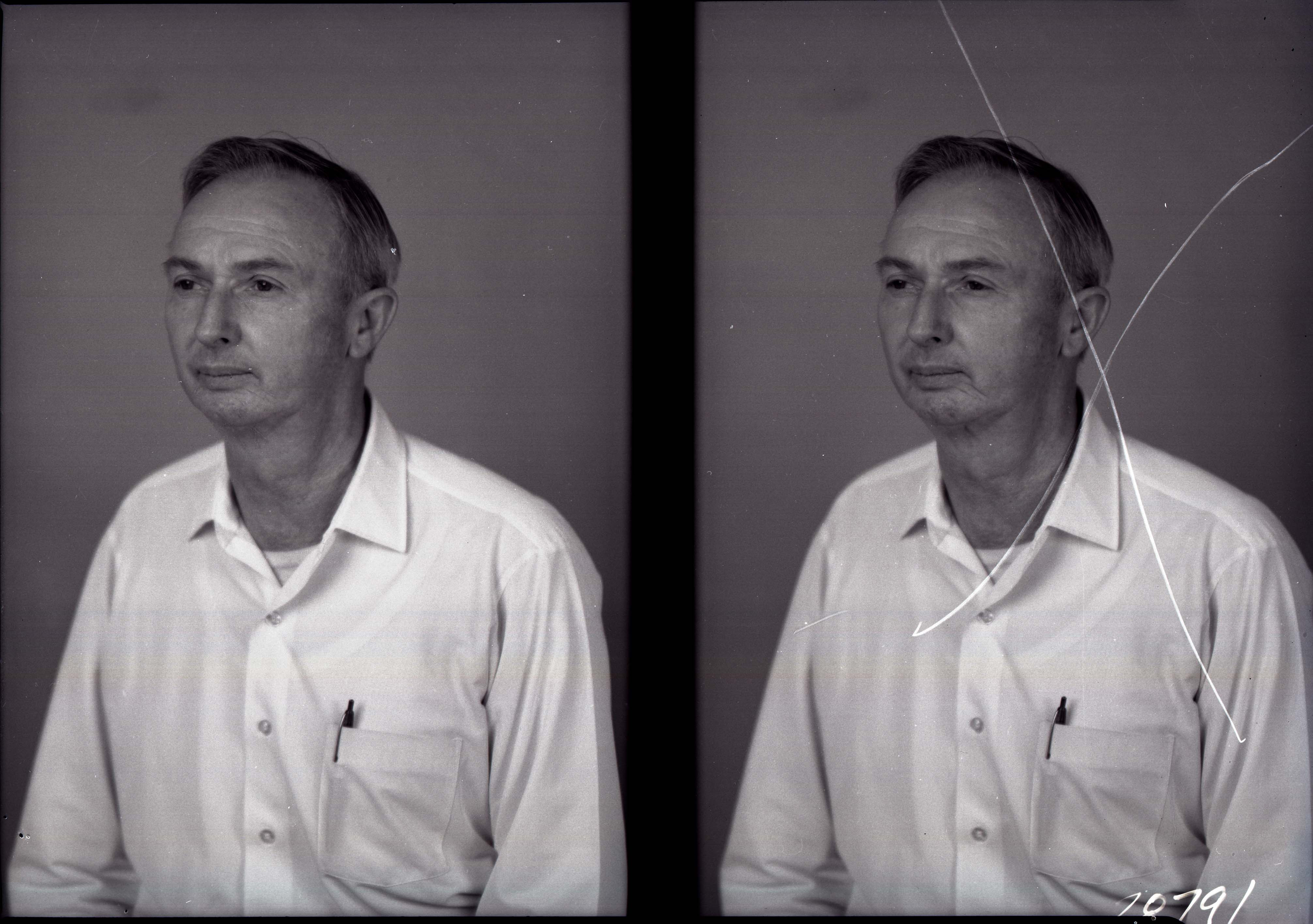 Photo of two separate portrait photographs of the same unidentified man wearing a collared shirt with a pen in the breast pocket.