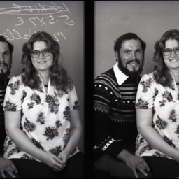 The man on the left has a beard and mustache. The young woman has long hair and is wearing glasses and a short-sleeved blouse.