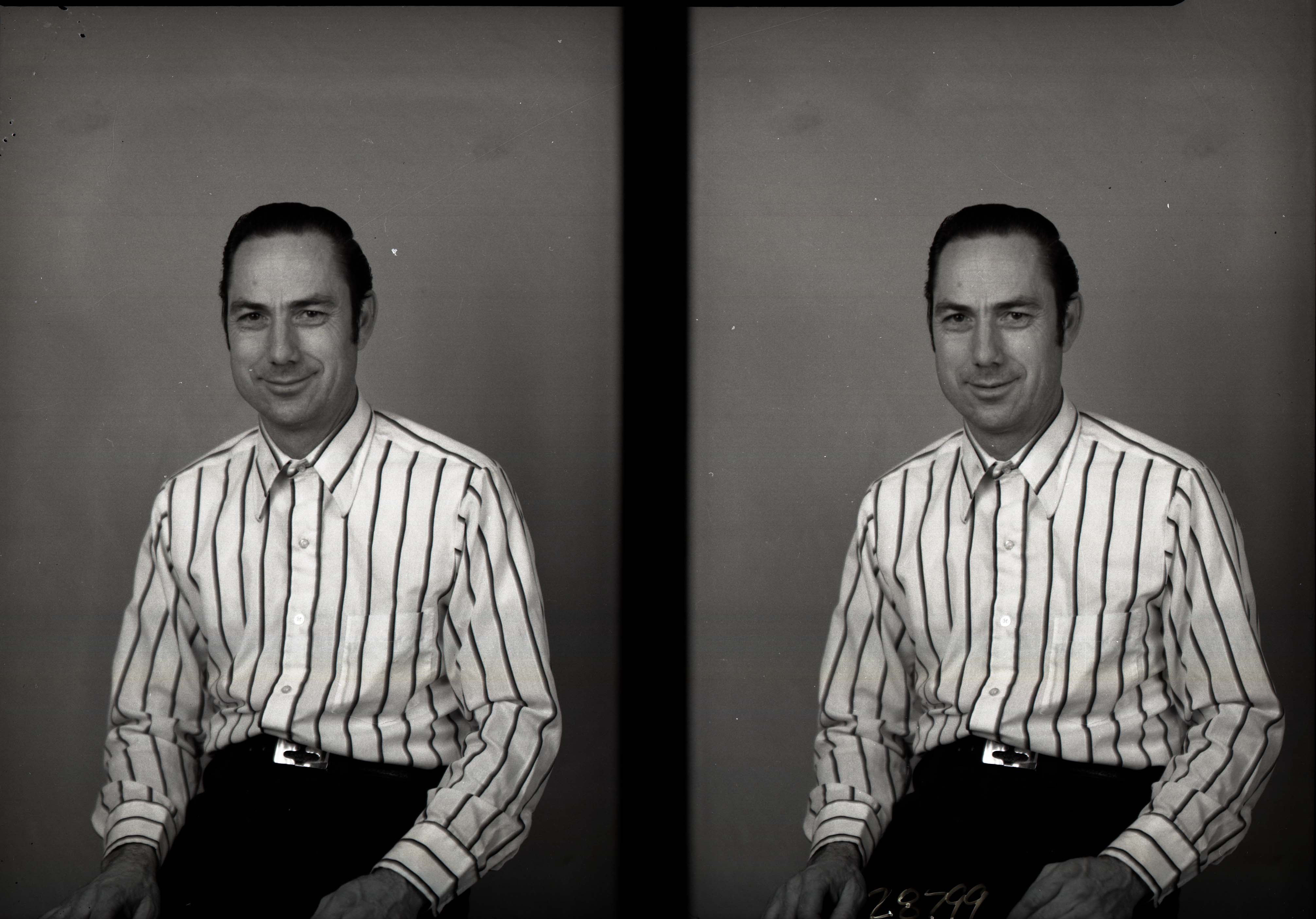 Photo of two separate portrait photographs of Galen A. Funkhouser wearing a striped shirt.